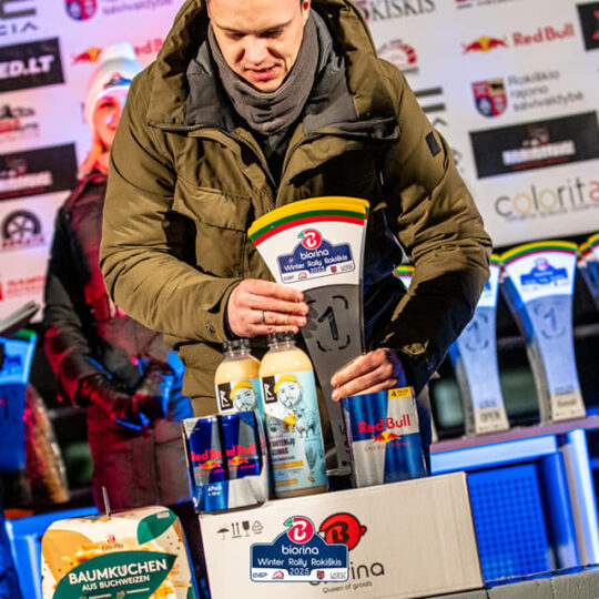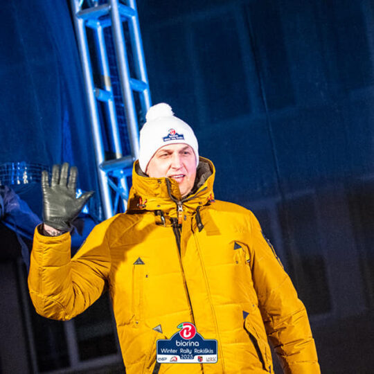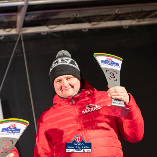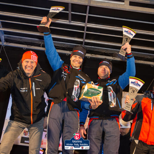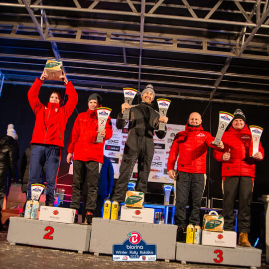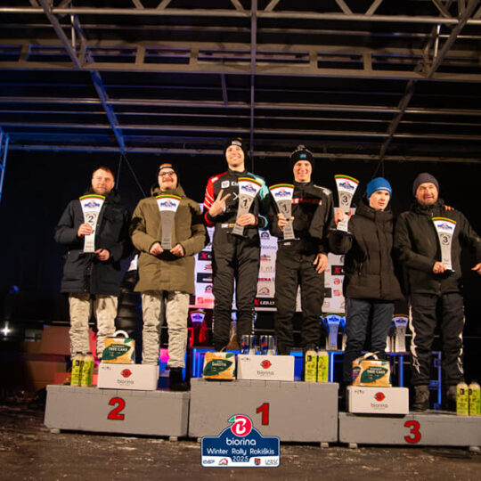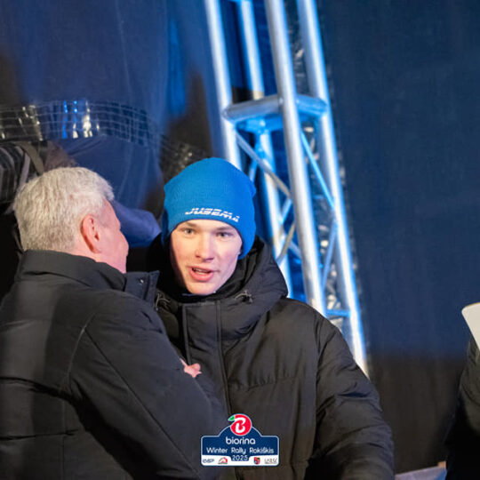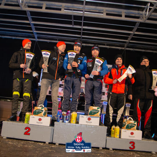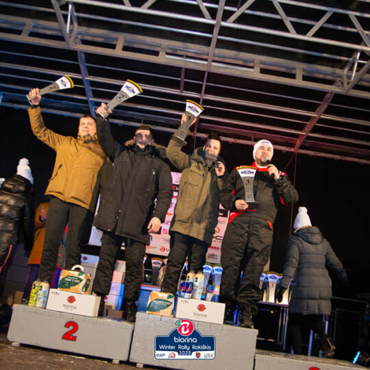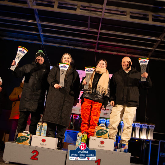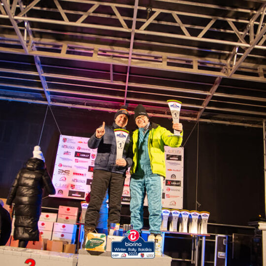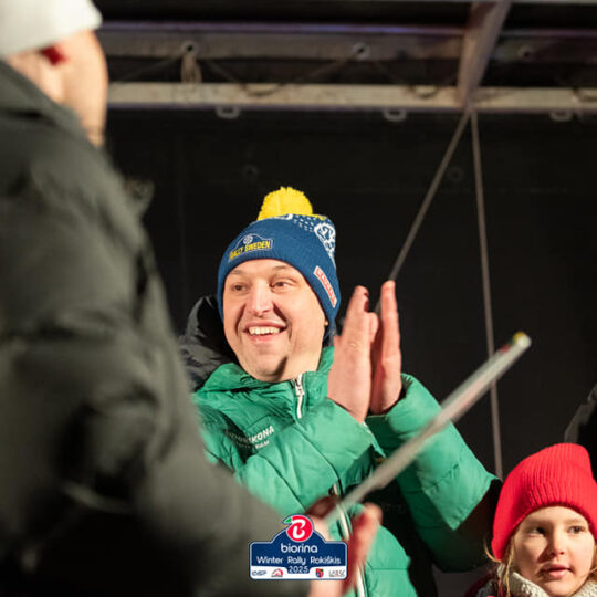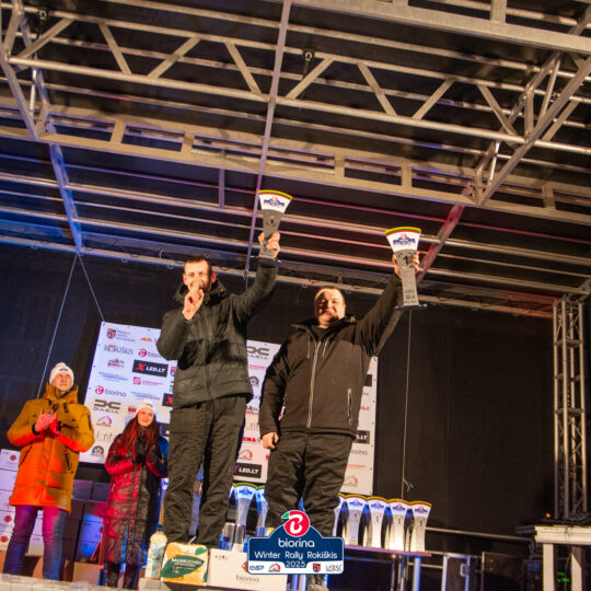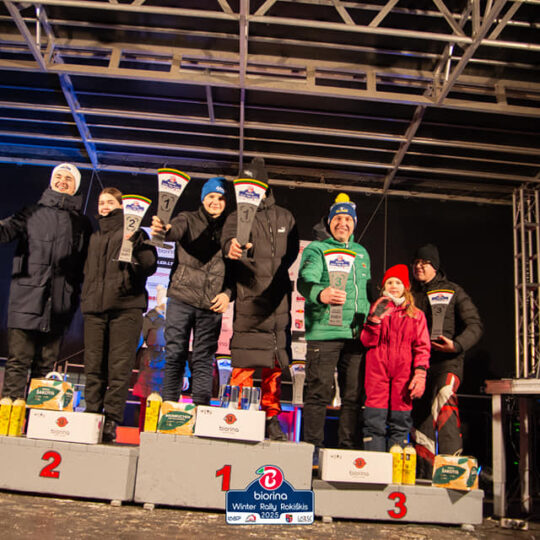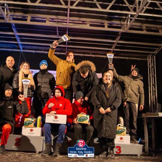 “Biorina Winter Rally Rokiškis 2025” dalyviai, įveikę greičio ruožus, rinkosi Sąjūdžio aikštėje, kur jų laukė apdovanojimų šventė.