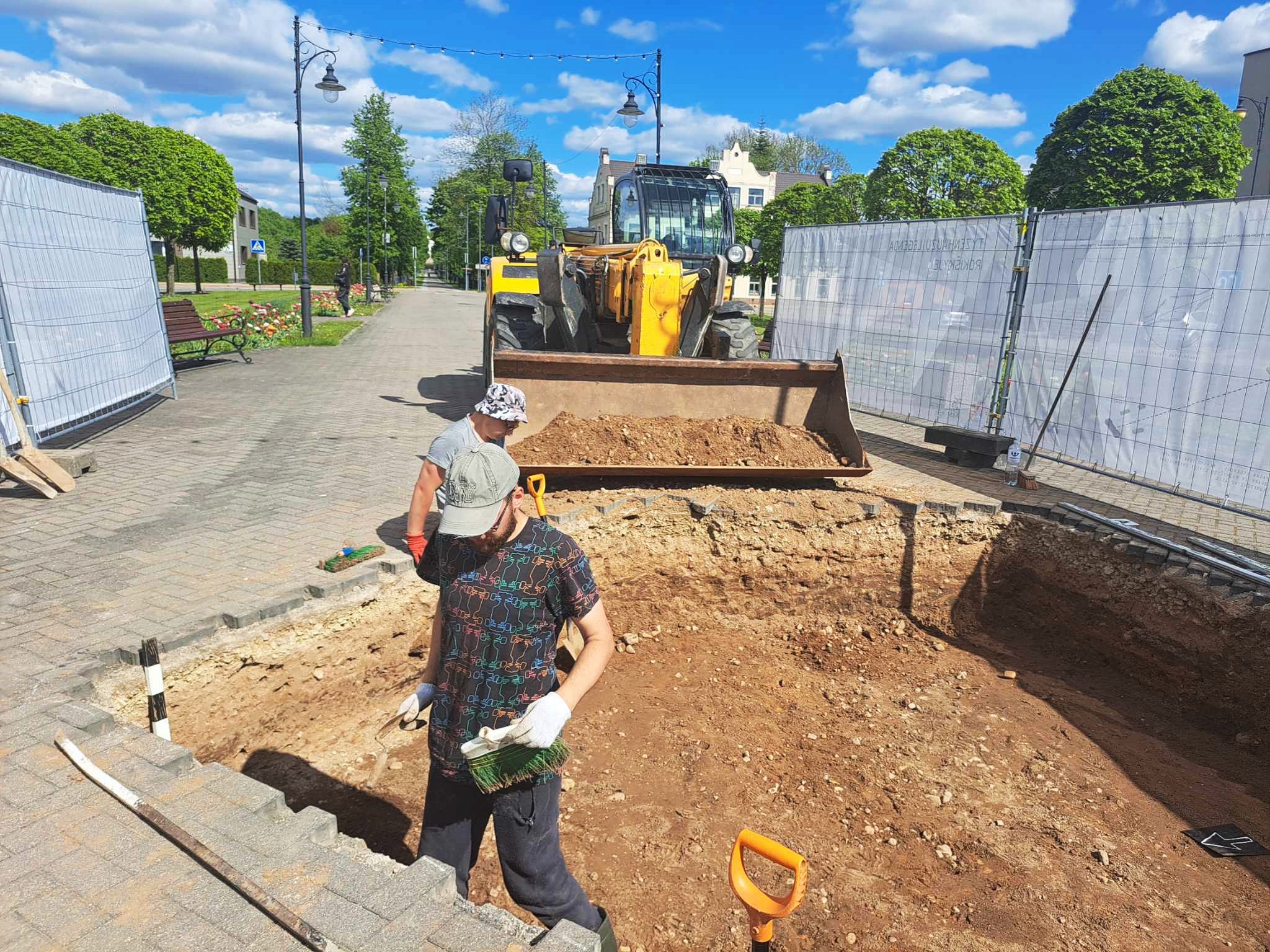 Maždaug 20 cm gylyje pasimatė anksčiau čia buvęs akmeninis grindinys. Rasti keletas artefaktų: metalinių sagtelių, monetų, nenustatytų daiktų detalių. Viena moneta – visai nesena, datuojama 1952 m. Kita, spėjama, sidabrinė moneta, paveikta oksidacijos procesų, todėl nėra matoma nei jos vertė, nei paleidimo į apyvartą metai. Archeologė R. Songailaitė, atvykusi iš Klaipėdos, tačiau jau senokai tyrinėjanti Rokiškio krašto istoriją, svarstė, kad akmeninį grindinį įveikti būtų lengviau, pasitelkus techniką. Iki tol nemažai darbo atliko vyrai su kastuvais.