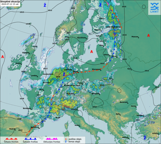 Šiandien Lietuvoje daug kur numatomi trumpi lietūs, perkūnija, kai kur smarkūs. Vietomis kruša, škvalas 15–20 m/s, kai kur 21–26 m/s.