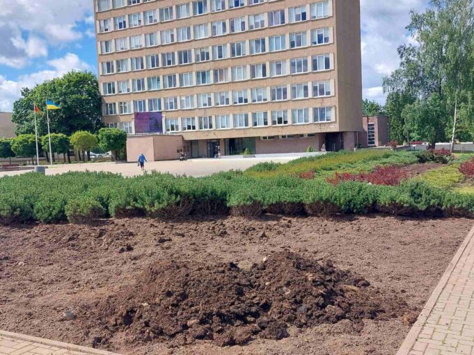 Šiandien prieš Rokiškio rajono savivaldybės pastatą esančiuose gėlynuose – sujudimas. Čia prasidėjo jų atnaujinimo ir gražinimo darbai.