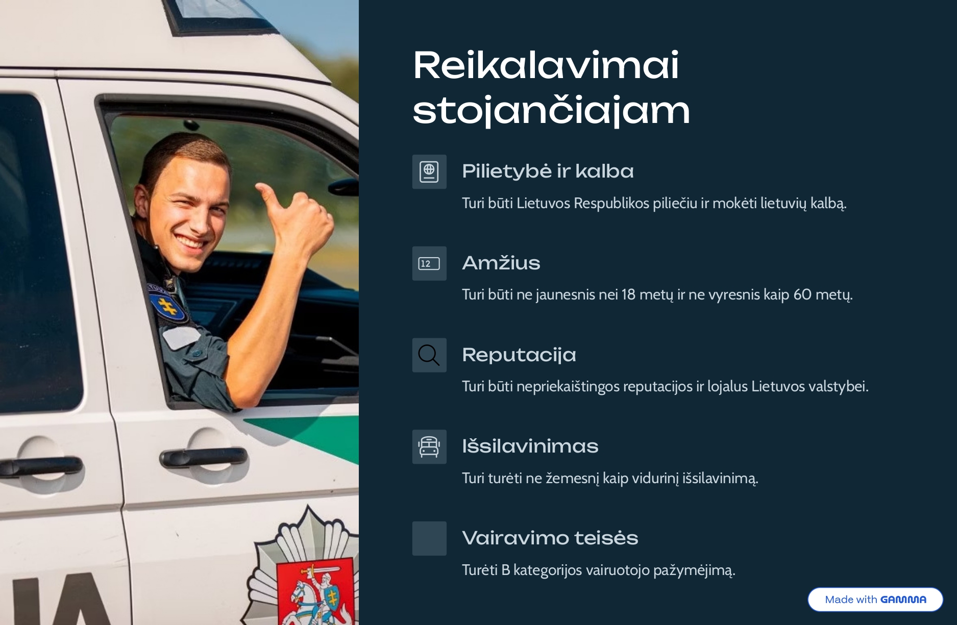 Tapti policijos bendruomenės dalimi gali platus ratas piliečių. Svarbiausia – noras tarnauti tėvynei ir atitikti pagrindinius kriterijus. Pretendentai privalo būti Lietuvos Respublikos piliečiai, mokėti valstybinę kalbą bei pasižymėti nepriekaištinga reputacija ir lojalumu valstybei.