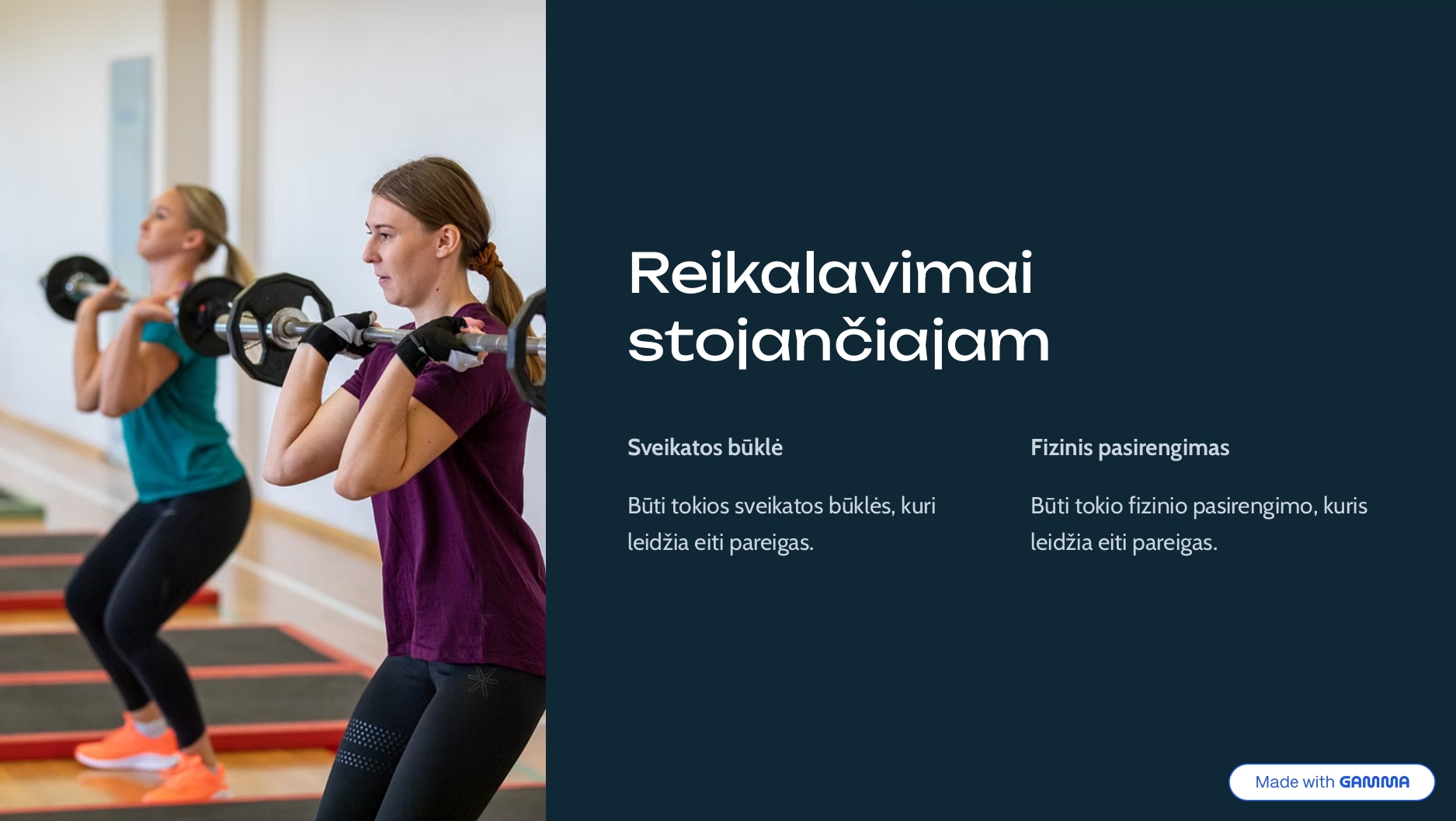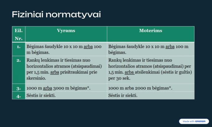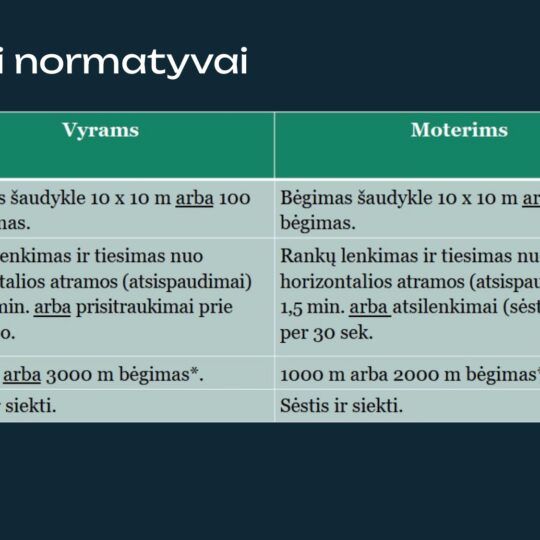 - Sveikata ir fizinis pasirengimas: vertinama pretendentų ištvermė, jėga ir bendra sveikatos būklė.