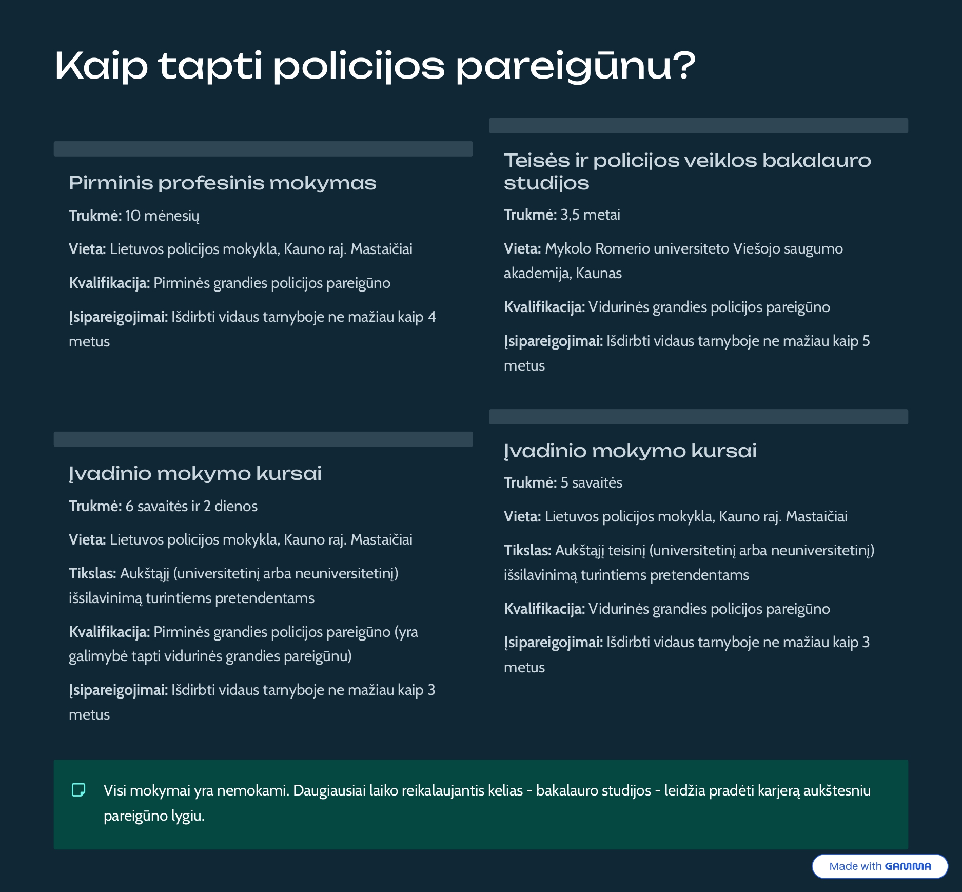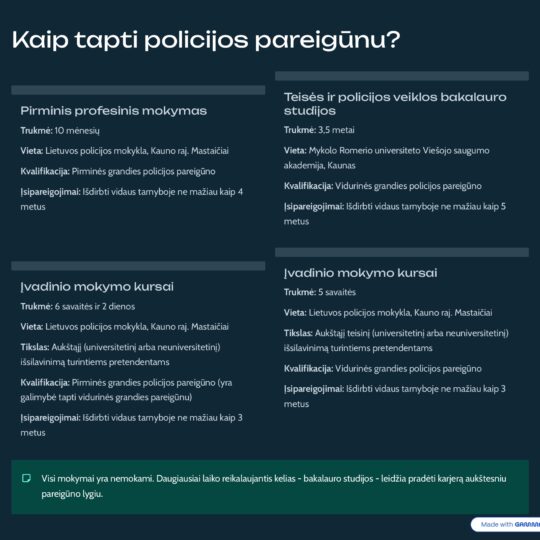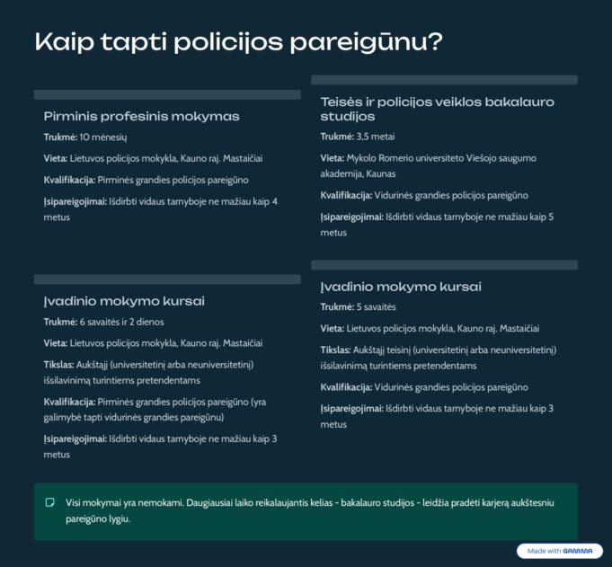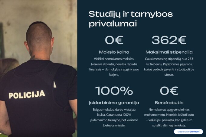 - Baigusiems mokyklą: 10 mėnesių mokymas Lietuvos policijos mokykloje (LPM). Kursantai aprūpinami nemokamu bendrabučiu ir gauna kasmėnesinę stipendiją (nuo 233 iki 362 Eur).