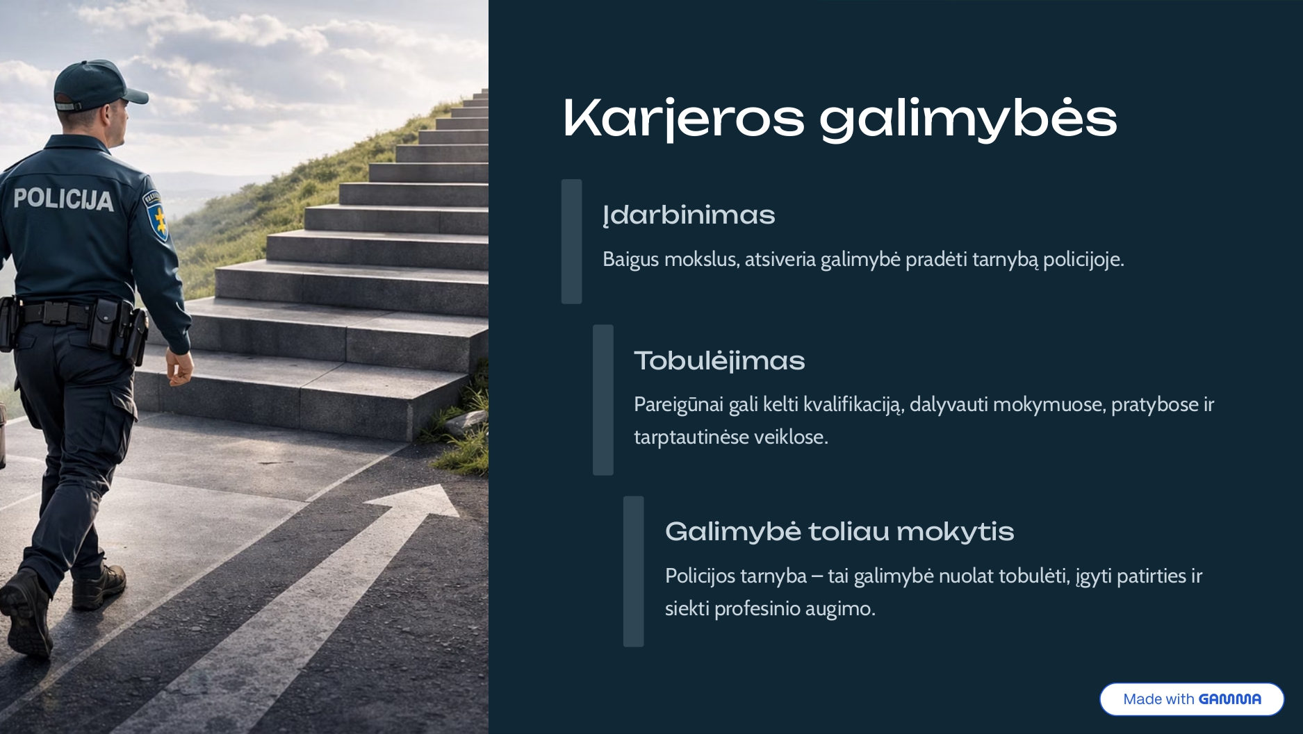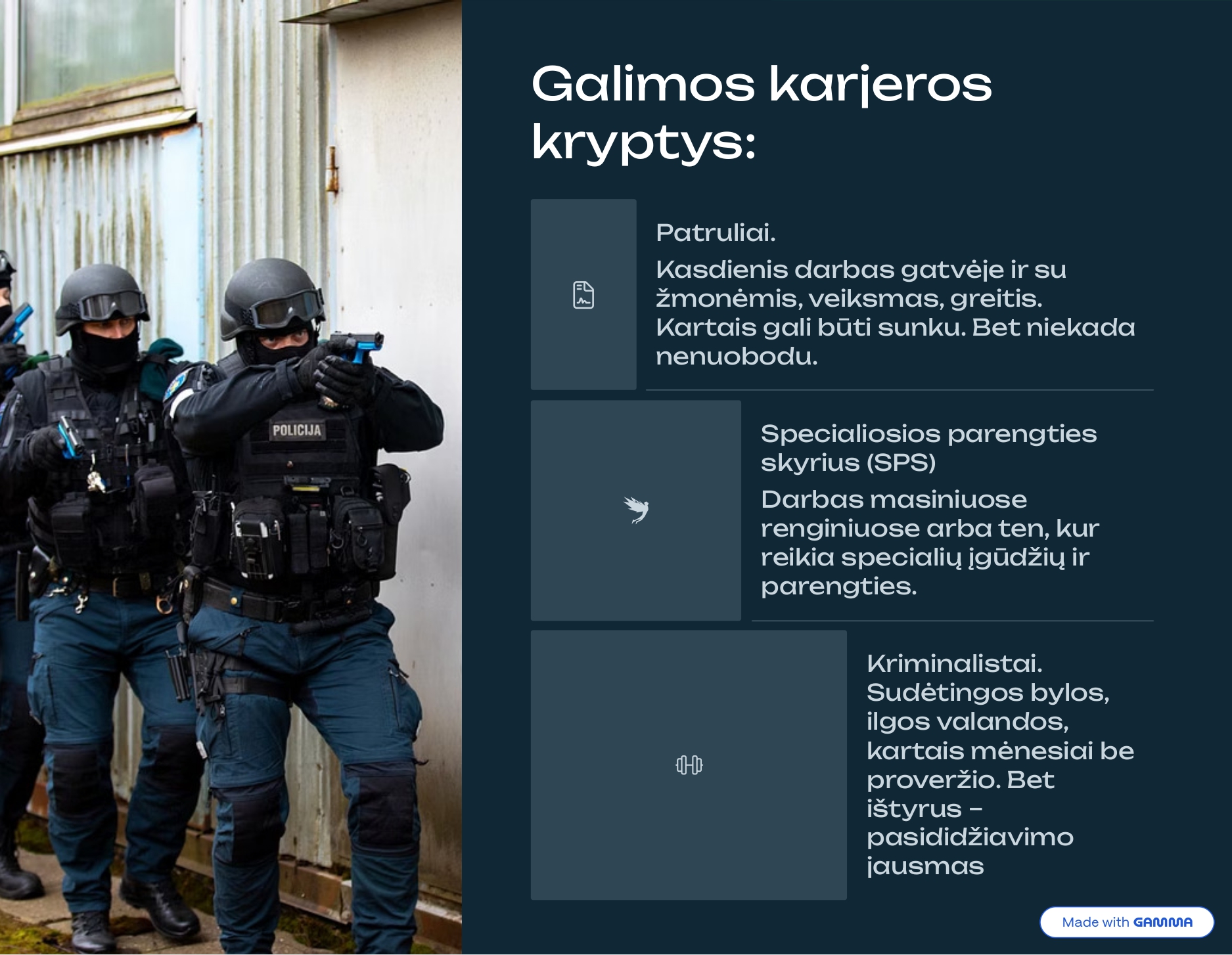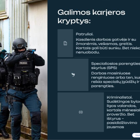 - Karjeros kryptys: galima rinktis patrulio darbą, tapti Specialiosios parengties skyriaus (SPS) nariu arba pasinerti į sudėtingas kriminalistines bylas, kurios reikalauja kantrybės ir aštraus proto.