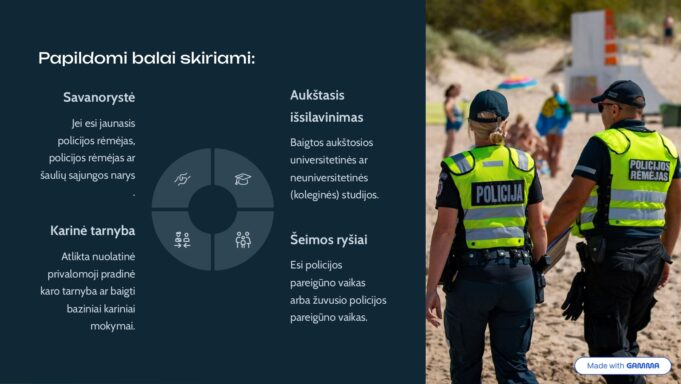 Papildomų balų atrankoje prideda savanorystė (policijos rėmėjų ar šaulių veikloje), atlikta karinė tarnyba, turimas aukštasis išsilavinimas ar net šeimos tradicijos – pavyzdžiui, jei tėvai taip pat yra pareigūnai.