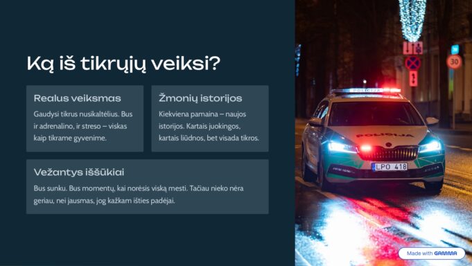 - Realaus veiksmo kupina kasdienybė: nusikaltėlių sulaikymai, adrenalinas ir operatyvumas.