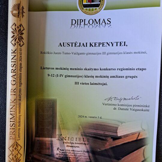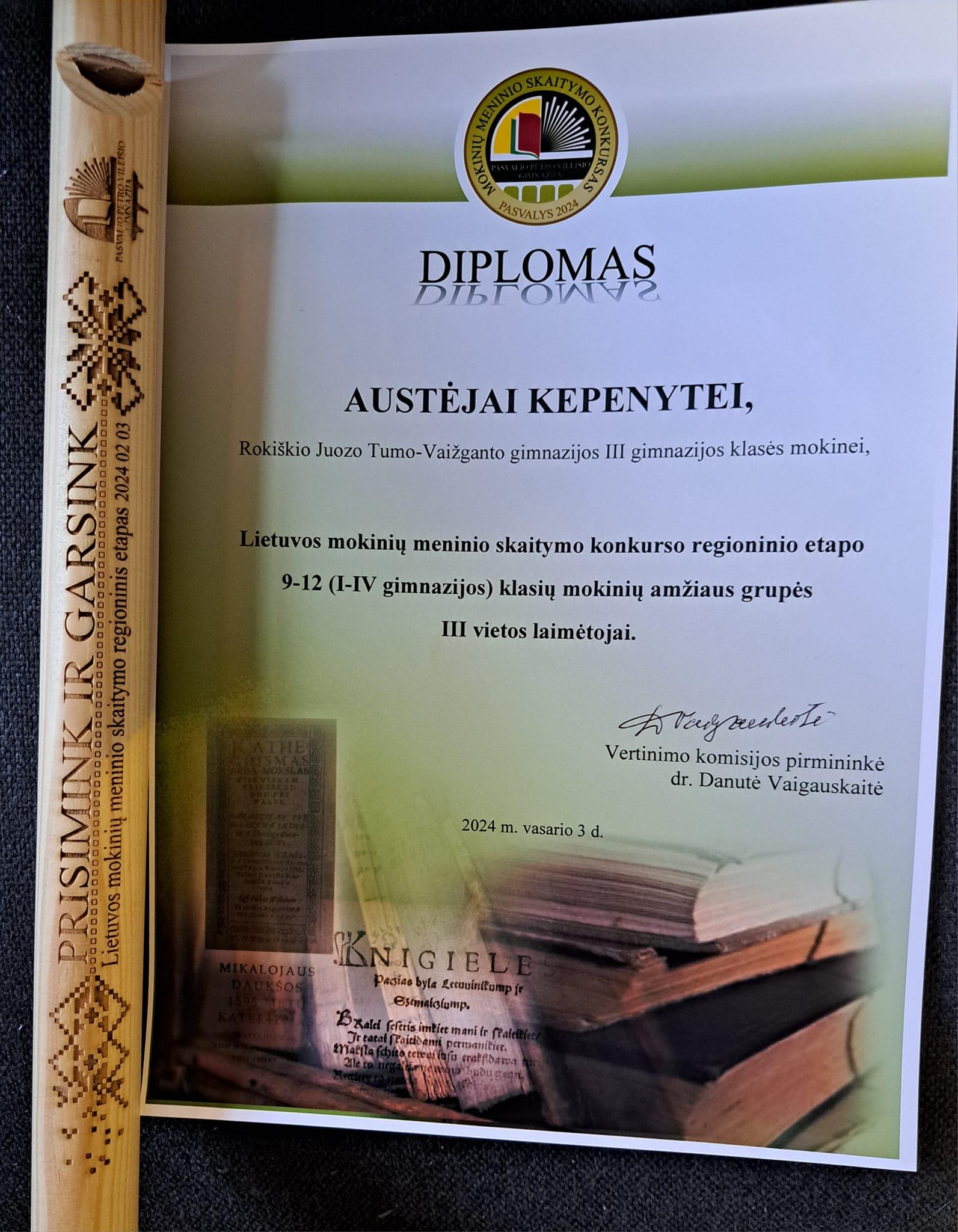 Rokiškio Juozo Tumo-Vaižganto gimnazijos „Romuvos“ padalinio III klasės mokinė Austėja Kepenytė dalyvavo Lietuvos mokinių meninio skaitymo konkurso regioniniame etape, kuris vyko Pasvalio Petro Vileišio gimnazijoje, ir tapo I–IV gimnazijos klasių mokinių grupės III vietos laimėtoja.