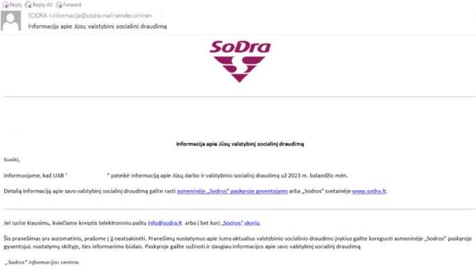 Sukčių laiškai siunčiami iš adreso informacija@sodra.mail-sender.online. Oficialūs „Sodros“ el. pašto adresai baigiasi galūne @sodra.lt