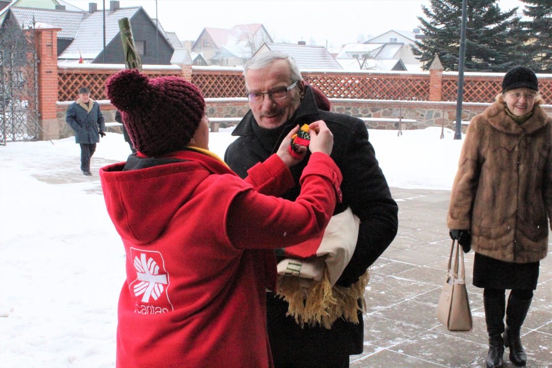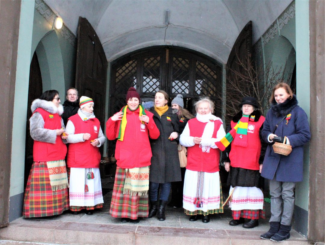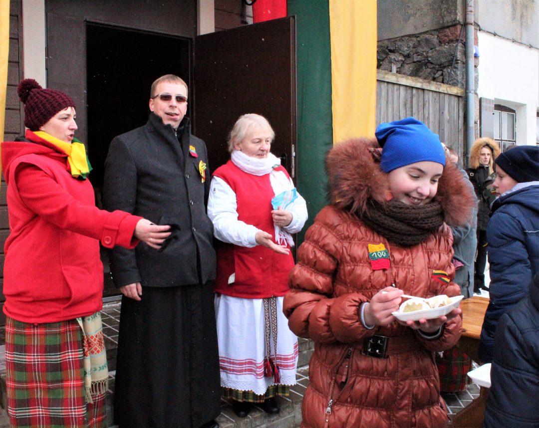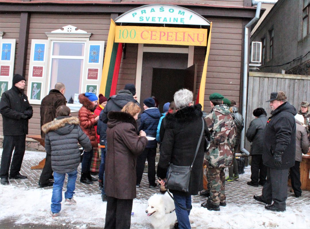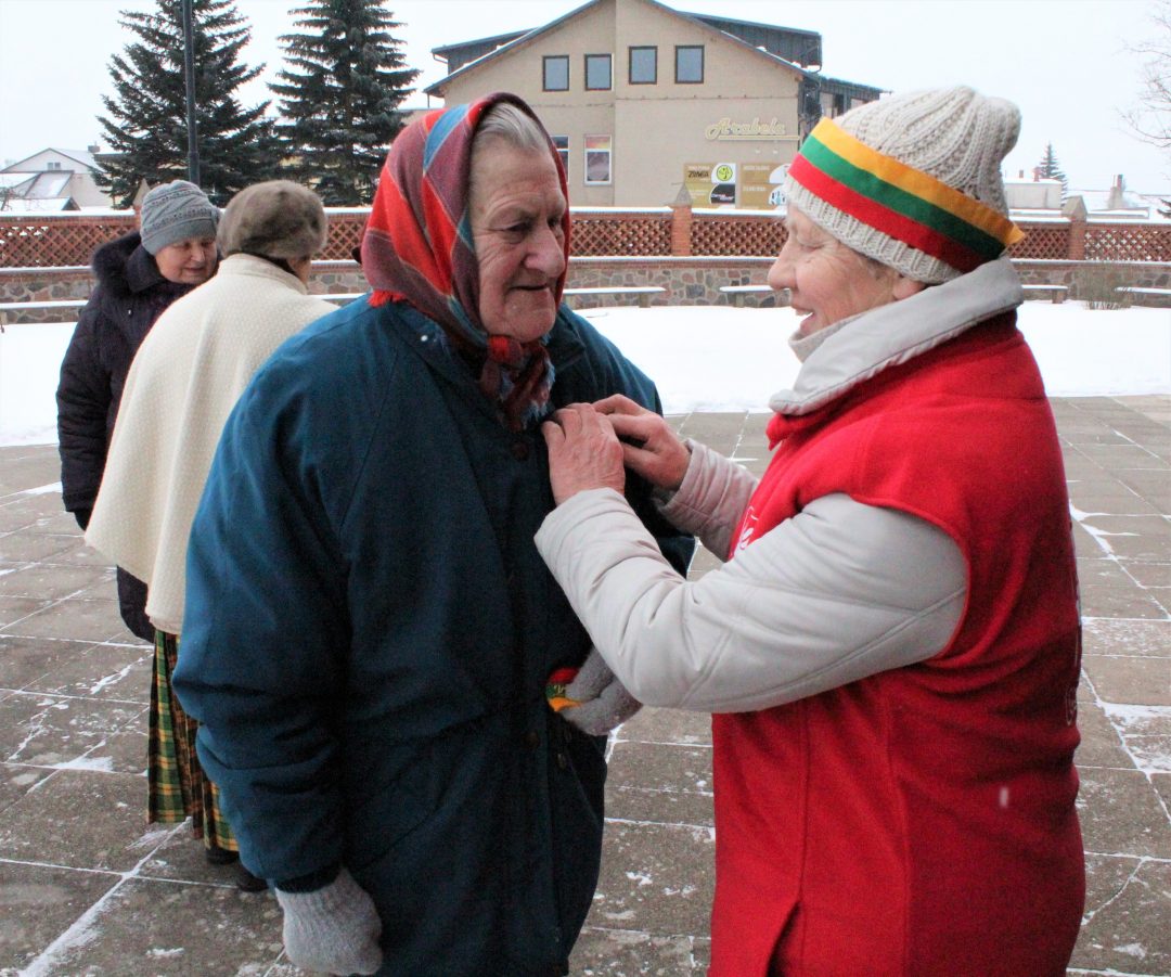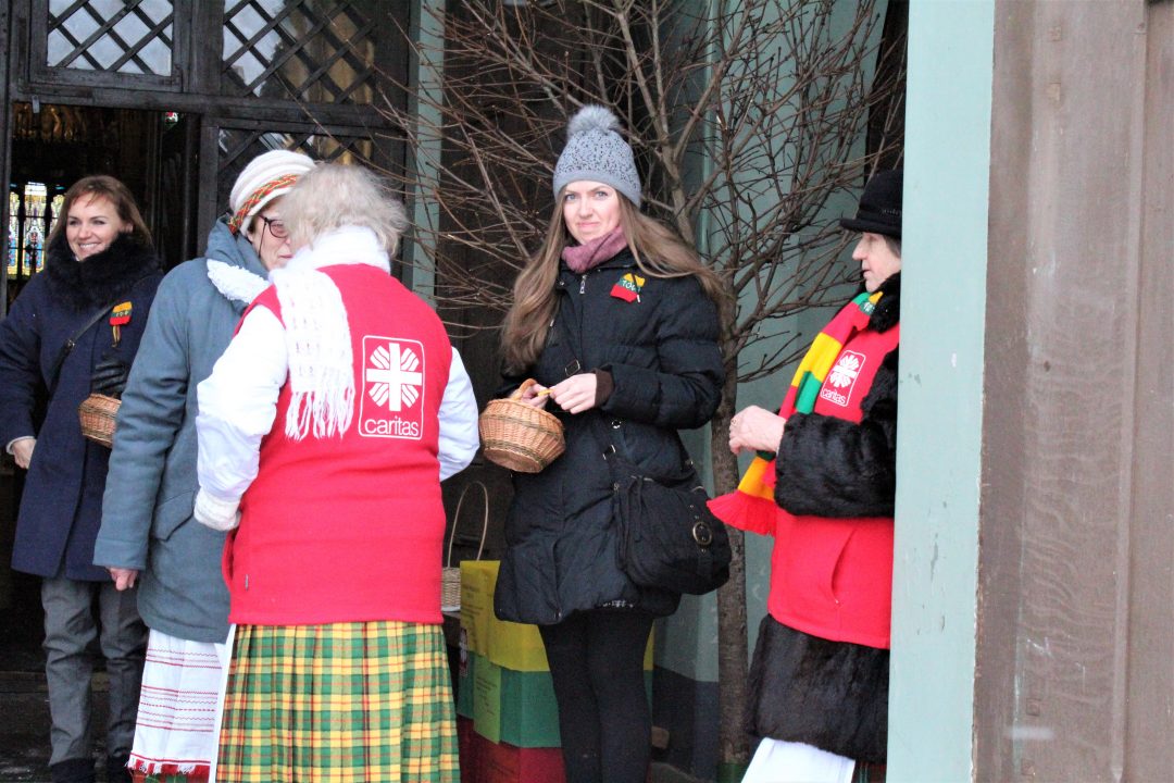Parapijiečius, vasario 16-ąją besirenkančius į šv. Mišias į Rokiškio Šv. apaštalo evangelisto Mato bažnyčioje, pasitiko Rokiškio „Carito“ savanoriai – visus sveikino šventės proga ir apdalino pačių megztomis trispalvėmis emblemomis su skaičiumi 100 – kad prisimintume, kokią reikšmingą dieną švenčiame.