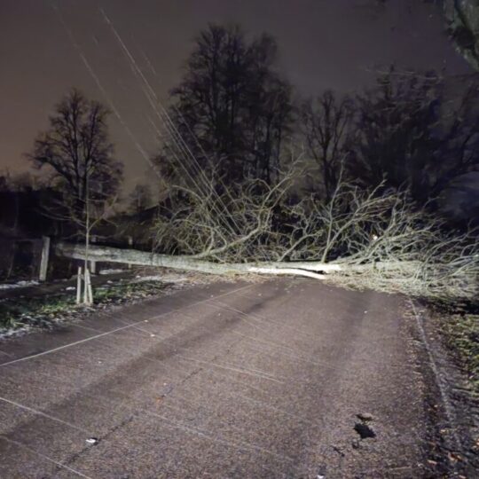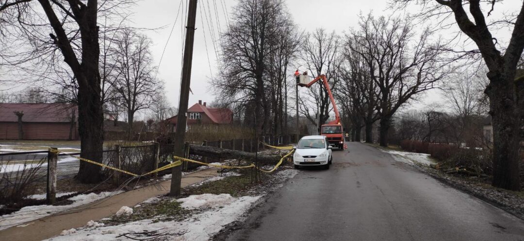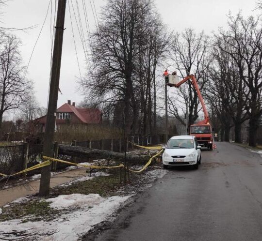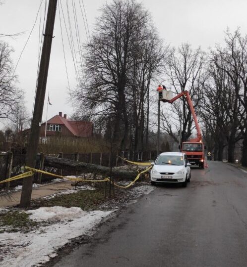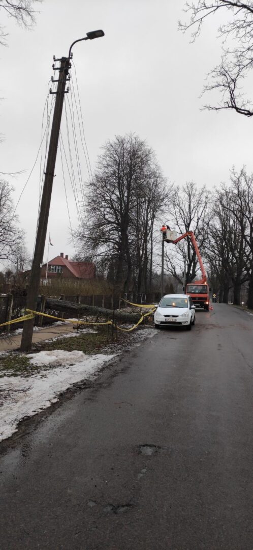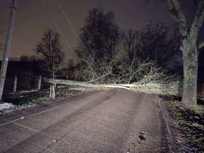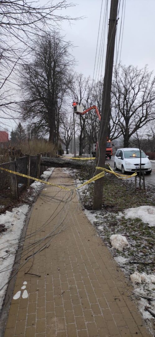 Virsdamas medis kliudė du elektros stulpus ir juos išvertė, dėl to visame kvartale dingo gatvės apšvietimas, medis užtvėrė važiuojamąją kelio dalį.