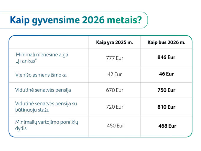 Nuo 2026 m. pradžios didės baziniai socialinių išmokų dydžiai. Bazinė socialinė išmoka (BSI) sieks 74 eurus vietoje 70 eurų. Padidinus šį dydį, atitinkamai padidėja nuo jo priklausančių išmokų dydžiai: visos išmokos, mokamos pagal Išmokų vaikams įstatymą (pavyzdžiui, išmoka vaikui (vaiko pinigai), vienkartinė išmoka gimus vaikui, vienkartinė išmoka nėščiai moteriai, globos (rūpybos) išmoka, globos (rūpybos) išmokos tikslinis priedas, vienkartinė išmoka įsikurti, išmoka besimokančio ar studijuojančio asmens vaiko priežiūrai) ir kitos socialinės išmokos.