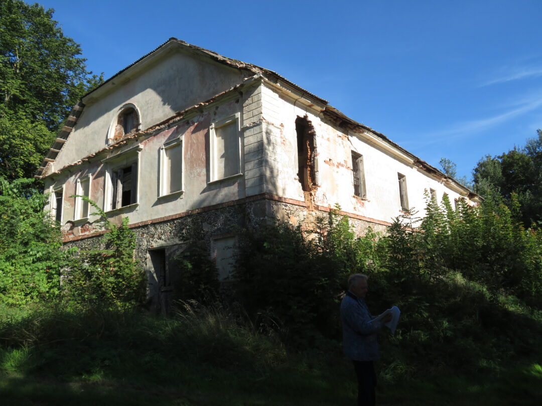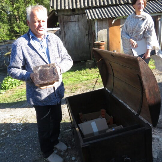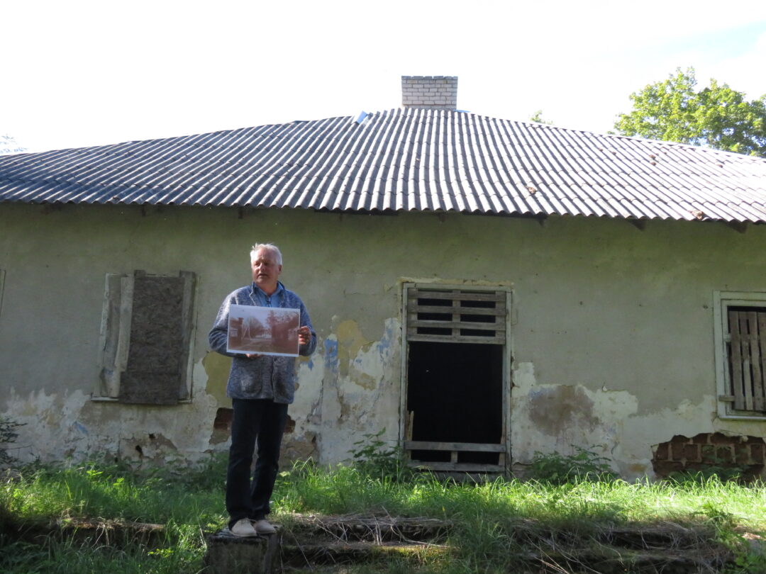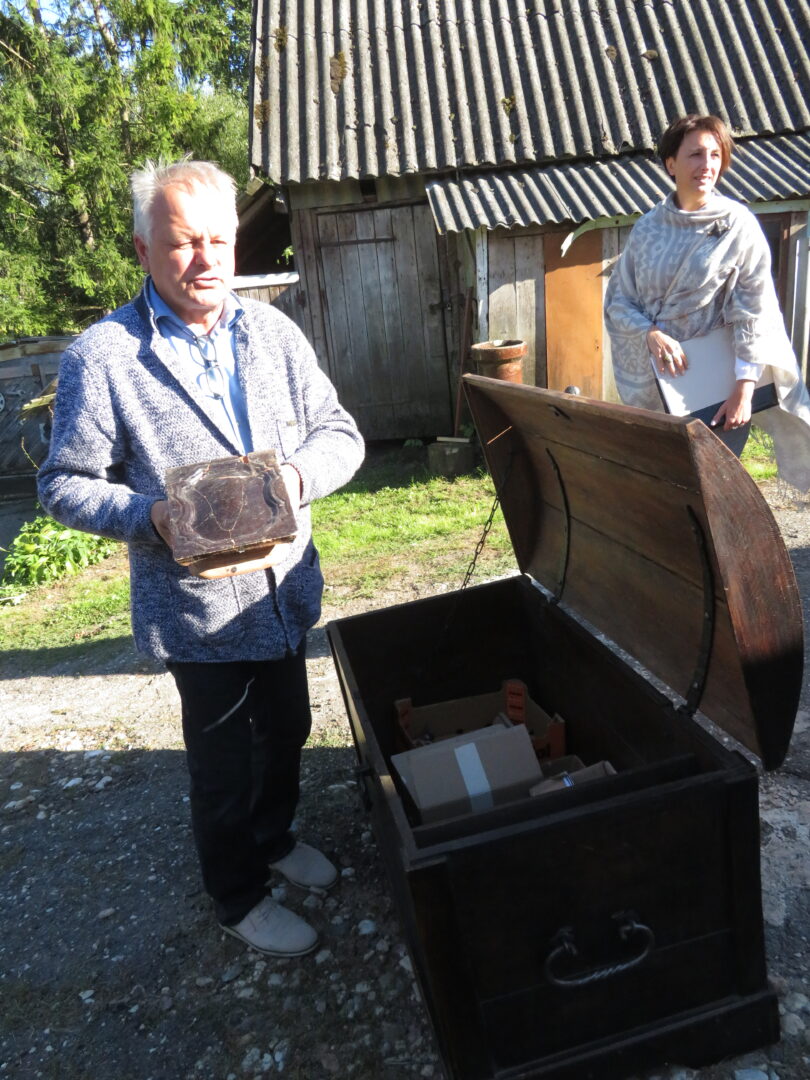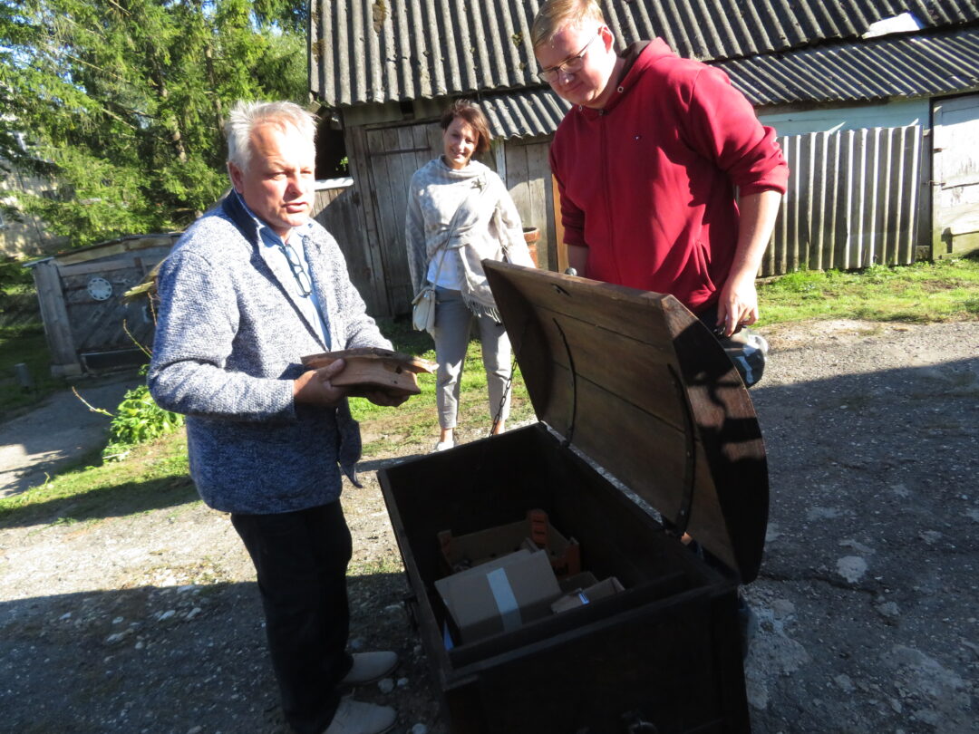 Netikėčiausia ekskursijos dalis laukė ant kalvelės įsikūrusiame A. Lapinsko kieme. Svečius pasitiko pats šeimininkas, 2020-2021 m. mielai įsileidęs istorikus, archeologus ir jų padėjėjus. Tuomet, ieškodami dvarui priklausiusių pastatų liekanų, kiemo teritorijoje prasmingai darbavosi archeologė Roma Songailaitė. Kasinėjimų metu atidengti senojo pastato pamatų fragmentai, pasiektos rūsio grindys. Rasta kelių šimtų metų mūro, heraldinių koklių fragmentų, molio keramikos šukių, monetų ir kitų archeologinių radinių fragmentų. O dabar ekskursantus nustebino kiemo viduryje pastatyta medinė skrynia su minėtais archeologiniais radiniais. Pasirodo, V. Kazlauskas sugalvojo įsimintiną ekskursijos finalą – skrynią su radiniais atgabeno iš muziejaus.