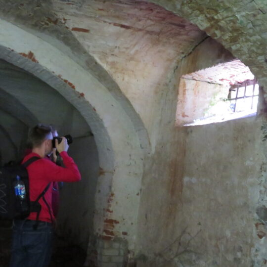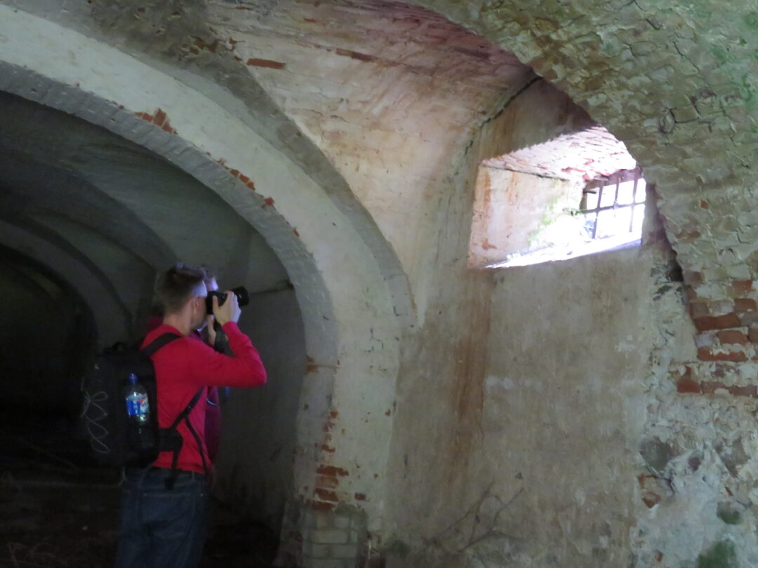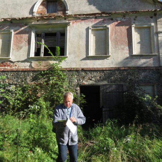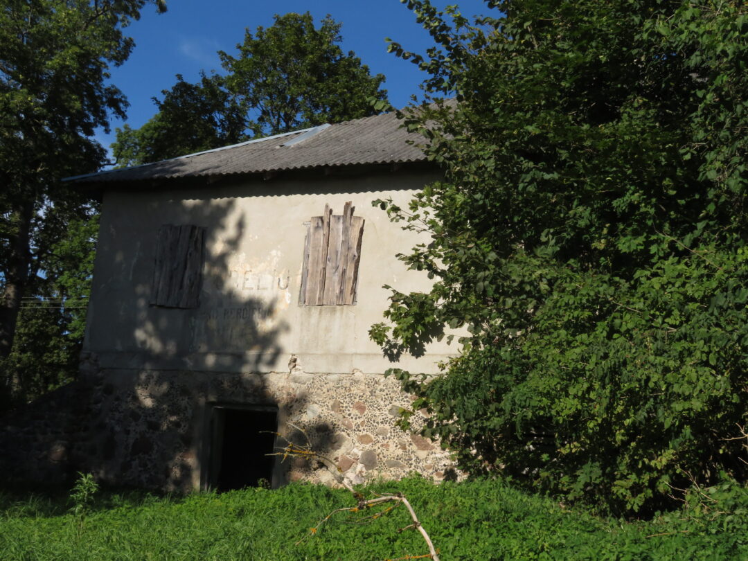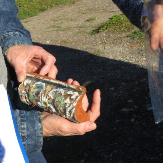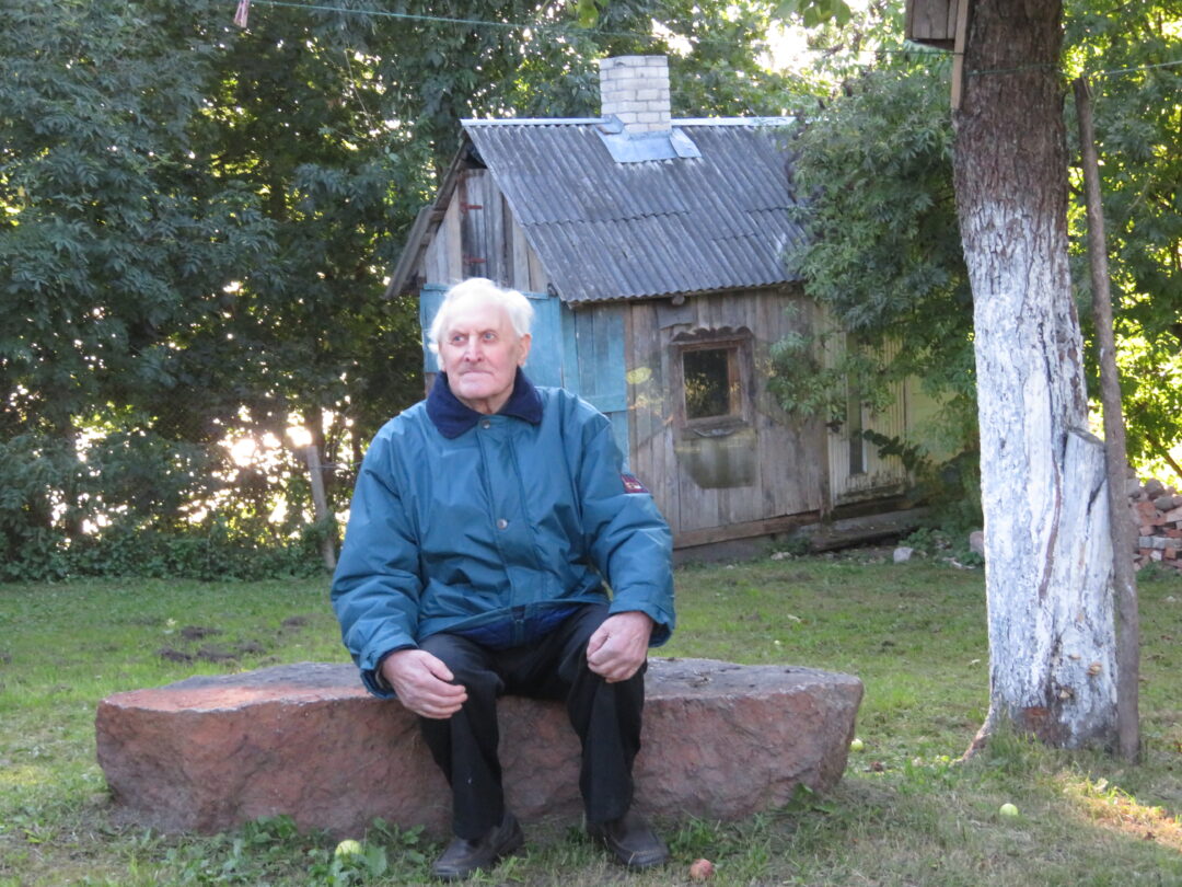 Netikėčiausia ekskursijos dalis laukė ant kalvelės įsikūrusiame A. Lapinsko kieme. Svečius pasitiko pats šeimininkas, 2020-2021 m. mielai įsileidęs istorikus, archeologus ir jų padėjėjus. Tuomet, ieškodami dvarui priklausiusių pastatų liekanų, kiemo teritorijoje prasmingai darbavosi archeologė Roma Songailaitė. Kasinėjimų metu atidengti senojo pastato pamatų fragmentai, pasiektos rūsio grindys. Rasta kelių šimtų metų mūro, heraldinių koklių fragmentų, molio keramikos šukių, monetų ir kitų archeologinių radinių fragmentų. O dabar ekskursantus nustebino kiemo viduryje pastatyta medinė skrynia su minėtais archeologiniais radiniais. Pasirodo, V. Kazlauskas sugalvojo įsimintiną ekskursijos finalą – skrynią su radiniais atgabeno iš muziejaus.