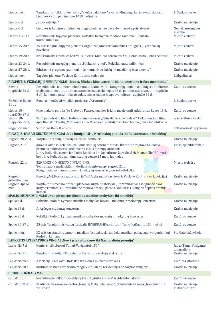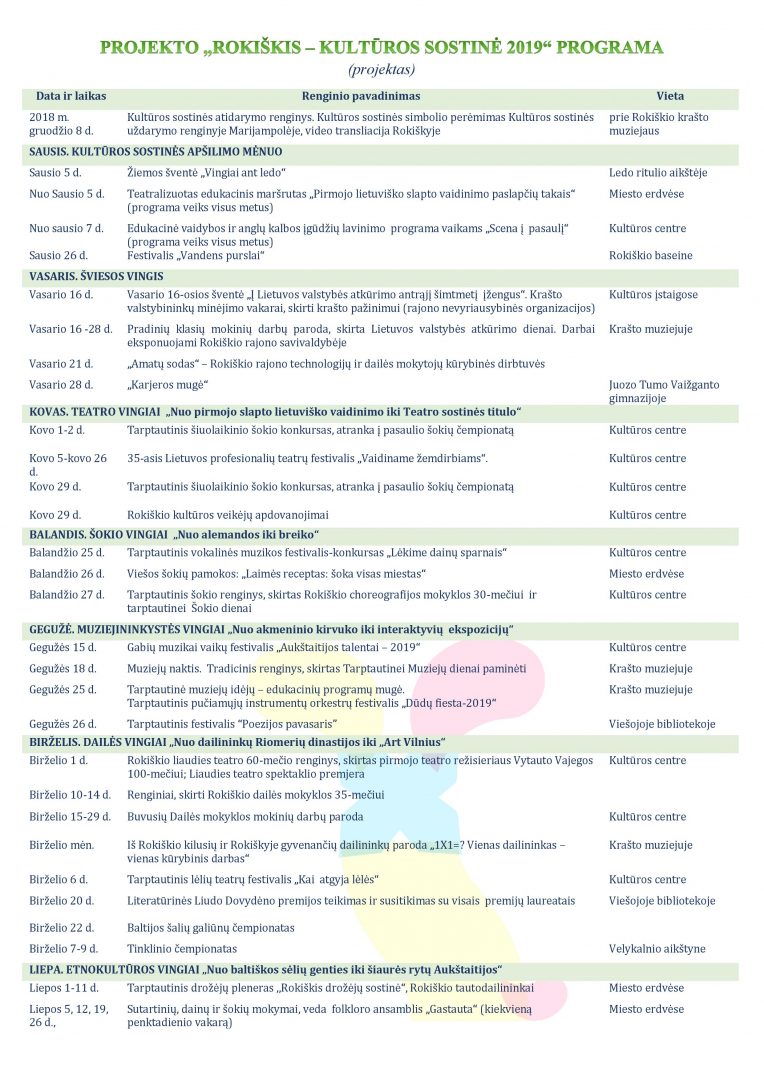 Pristatome projekto „Rokiškis – Lietuvos kultūros sostinė 2019“ darbo grupės sudarytą preliminarų pagrindinių renginių plano projektą, kuris dar nėra galutinis. Pateikiamame plano projekte dar nėra renginių, vyksiančių rajono kaimiškojoje teritorijoje ir atspindėsiančių sostinės teminius mėnesius – jie turėtų būti pateikti gegužės antrojoje pusėje. Nepateikiami ir rajono nevyriausybinių organizacijų (asociacijų) renginiai, nes jiems planuojamas atskiras projektų rėmimo fondas, kuris turėtų būti sukurtas antrajame šių metų pusmetyje. Atskirai aptarinėjami ir šiame plane nepateikiami kultūros sostinės metams skirtų įamžinimų planai (skulptūros, krašto kultūros asmenybių įamžinimo galimybės, monumentalioji tapyba, Nepriklausomybės aikštės pastatų istorinis įprasminimas). Dar aptarinėjami nauji mūsų, kultūros sostinės, ambasadorių siūlymai, kurių atsiranda vis naujų.