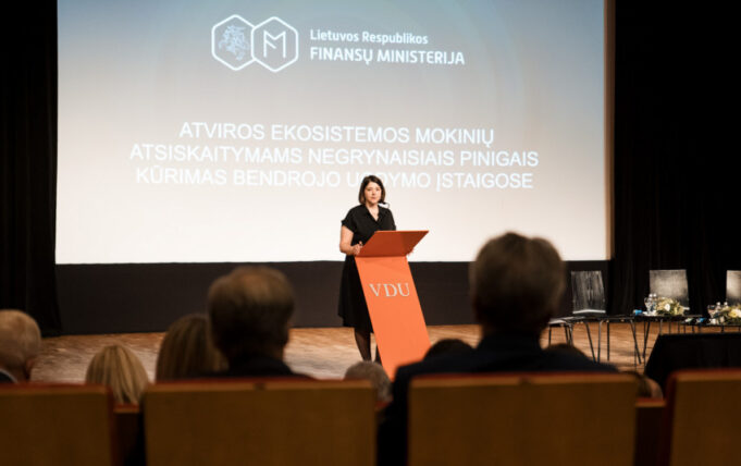 Finansų ministerijos organizuotame renginyje finansų ministrė Gintarė Skaistė savivaldybėms ir mokyklų vadovams ketvirtadienį pristatė projektą, skirtą skatinti mokinių atsiskaitymus negrynaisiais pinigais mokyklų valgyklose.