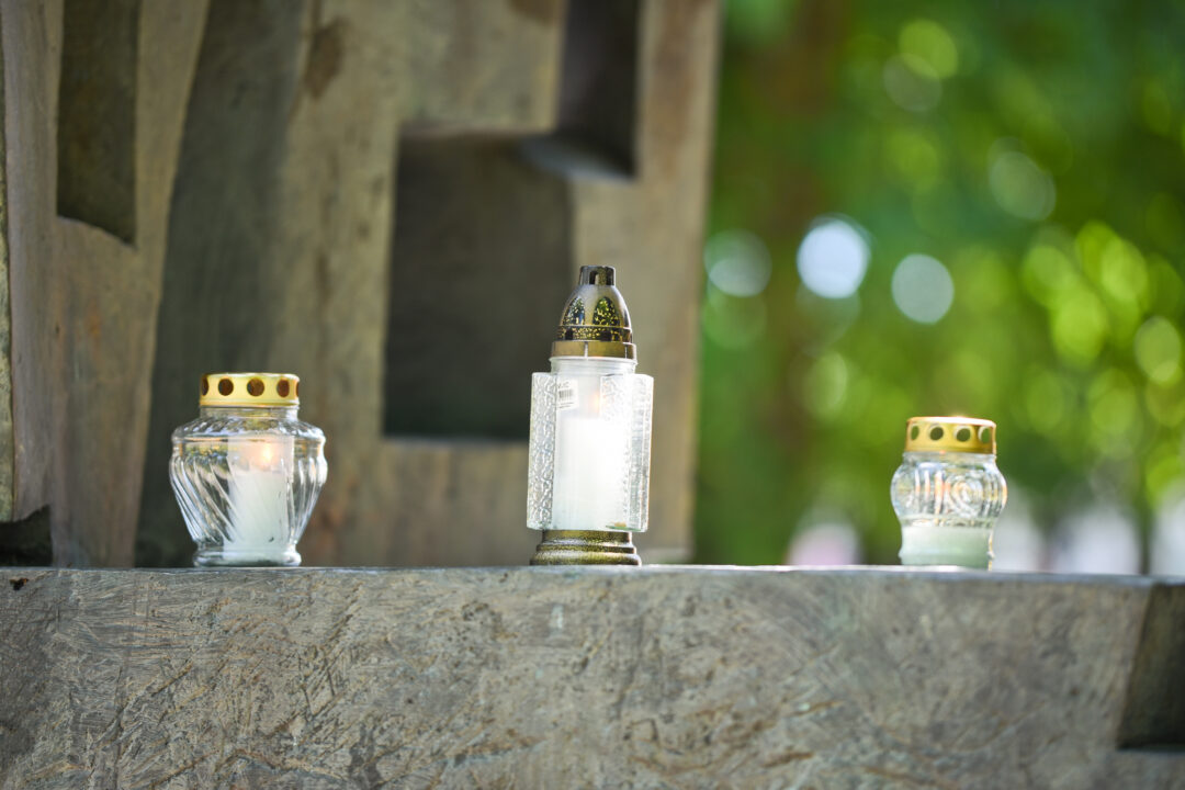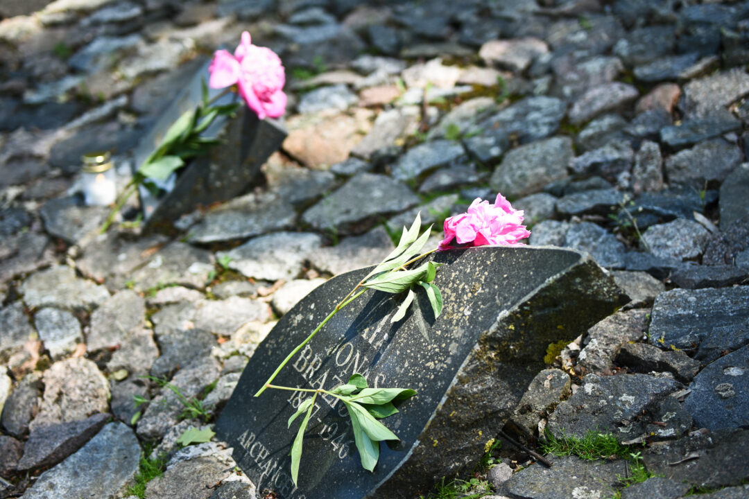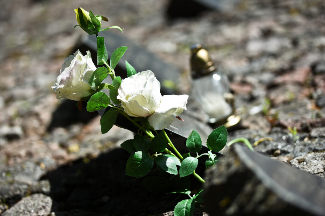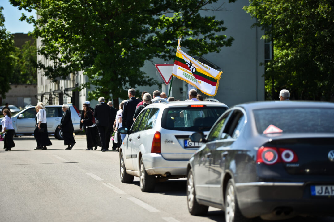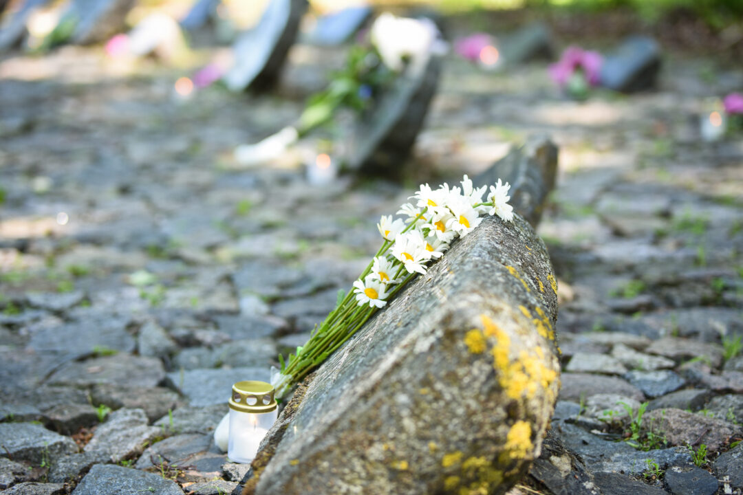 Prie paminklo nugulė gėlių, puokščių bei žvakučių jūra.