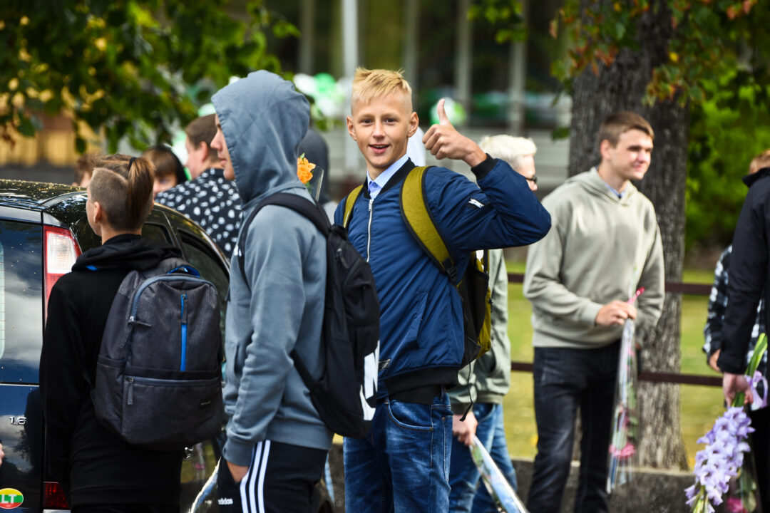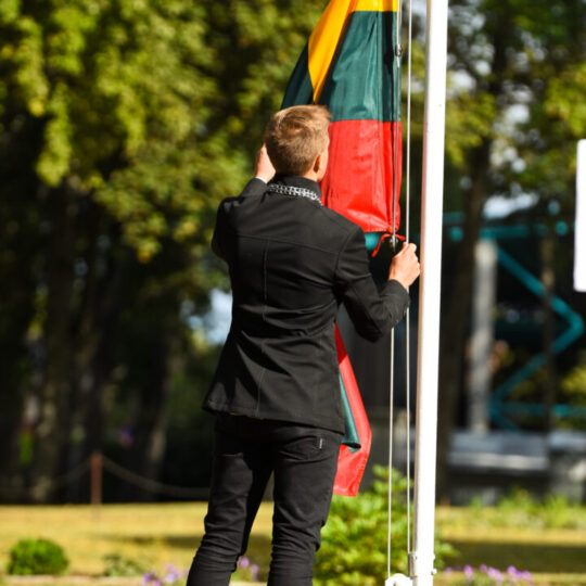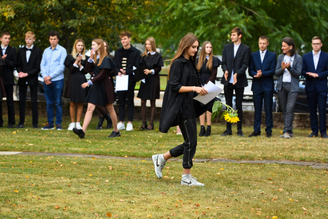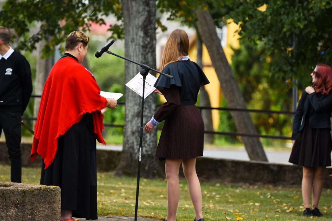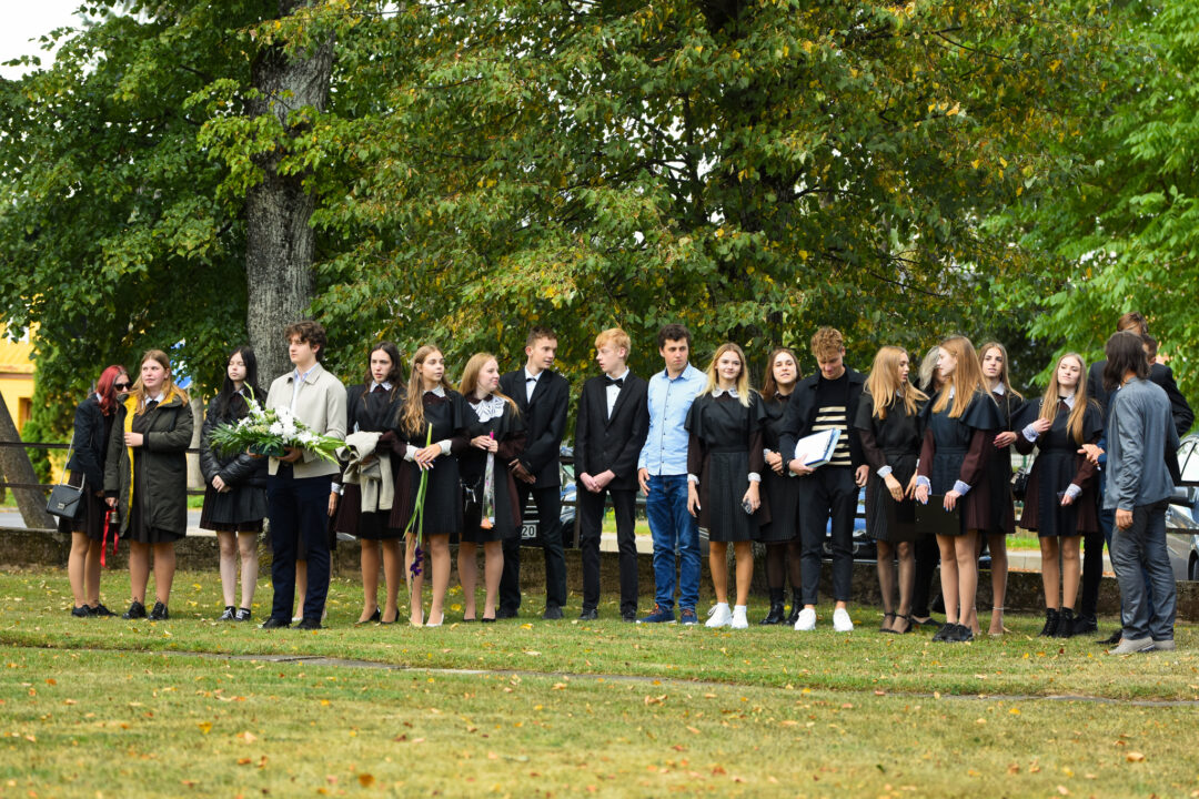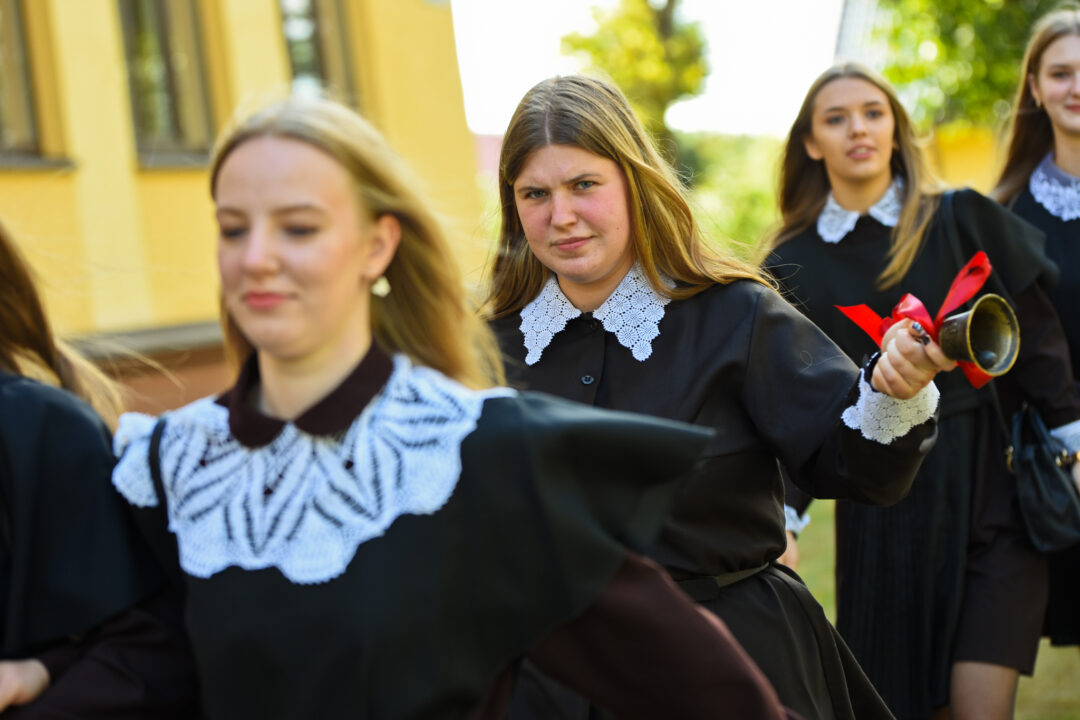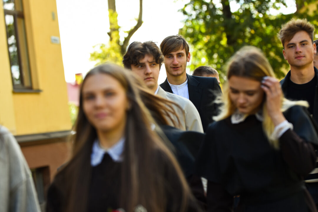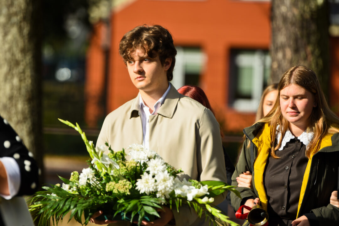 Juozo Tumo-Vaižganto gimnazijos Senieji rūmai šventę pradėjo tradicine dvyliktokų eisena mokyklos link, kur jų jau laukė išsirikiavę kiti mokyklos mokiniai bei mokytojai. Šventė prasidėjo nuo naujojo mokyklos prezidento Pijaus Raugalės inauguracijos. Naujasis mokyklos prezidentas palinkėjo gerų mokslo metų, o dvyliktokams – stiprybės ir darbštumo. Sugiedotas ir J. Tumo-Vaižganto gimnazijos himnas bei tradiciškai iškelta Lietuvos trispalvė. Sveikinimus pratęsė mokyklos direktoriaus pavaduotoja Jolanta Juodinytė. Už praėjusių mokslo metų pasiekimus apdovanoti moksleiviai. Girdėti žodžiai apie Ukrainą, linkėta visiems gerų ir taikių mokslo metų. Prie sveikinimų prisidėjo ir rajono savivaldybės Švietimo ir sporto skyriaus vedėjas Aurimas Laužadis. Jis palinkėjo rimto požiūrio į mokslą ir pagaliau išsirinkti mokyklos direktorių.