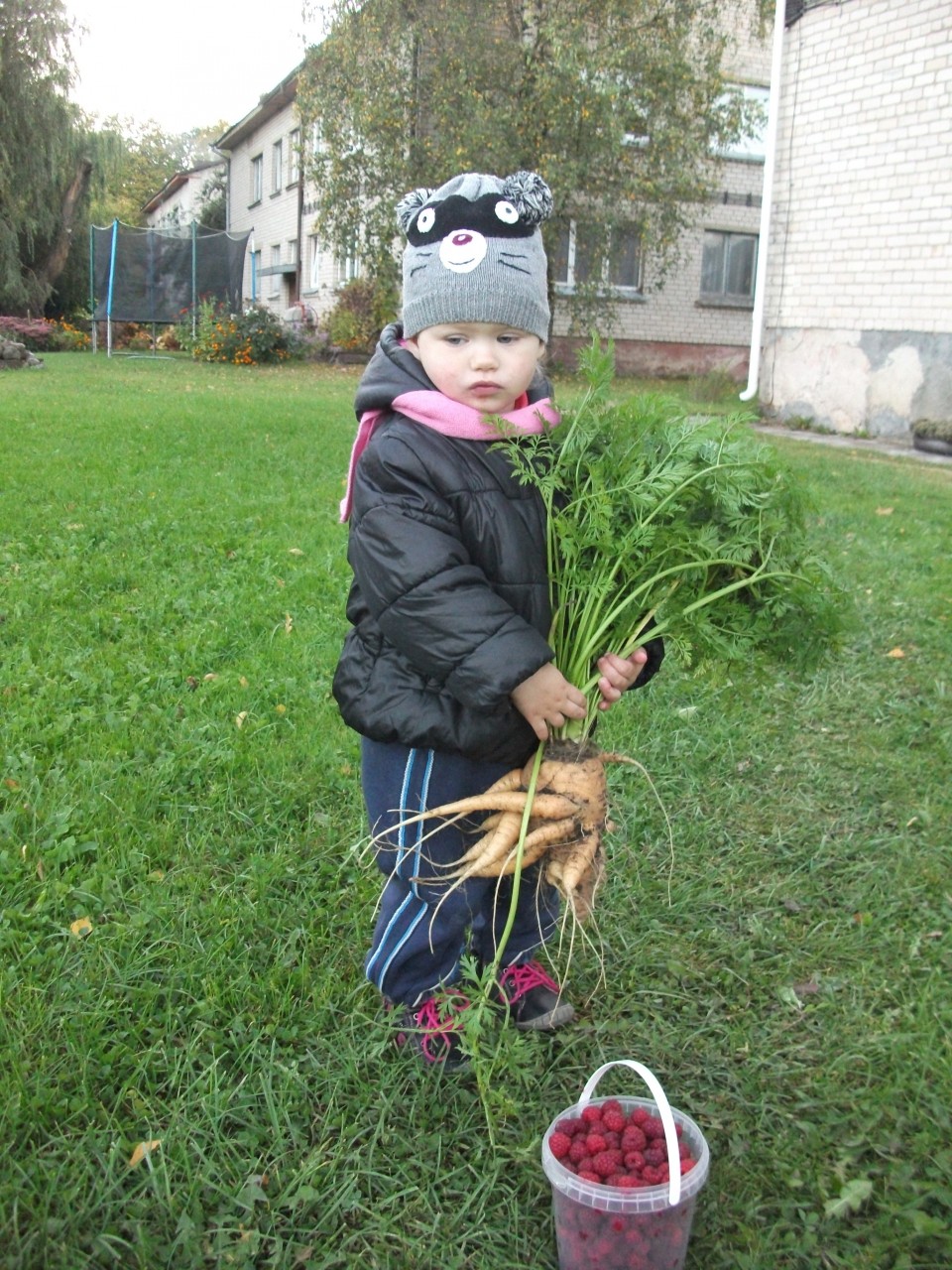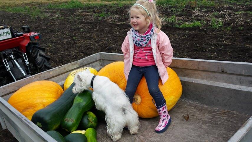 Austėja Jankūnaitė su šuniuku Dadu apžiūri derlių. Justinos Jankūnienės nuotr.