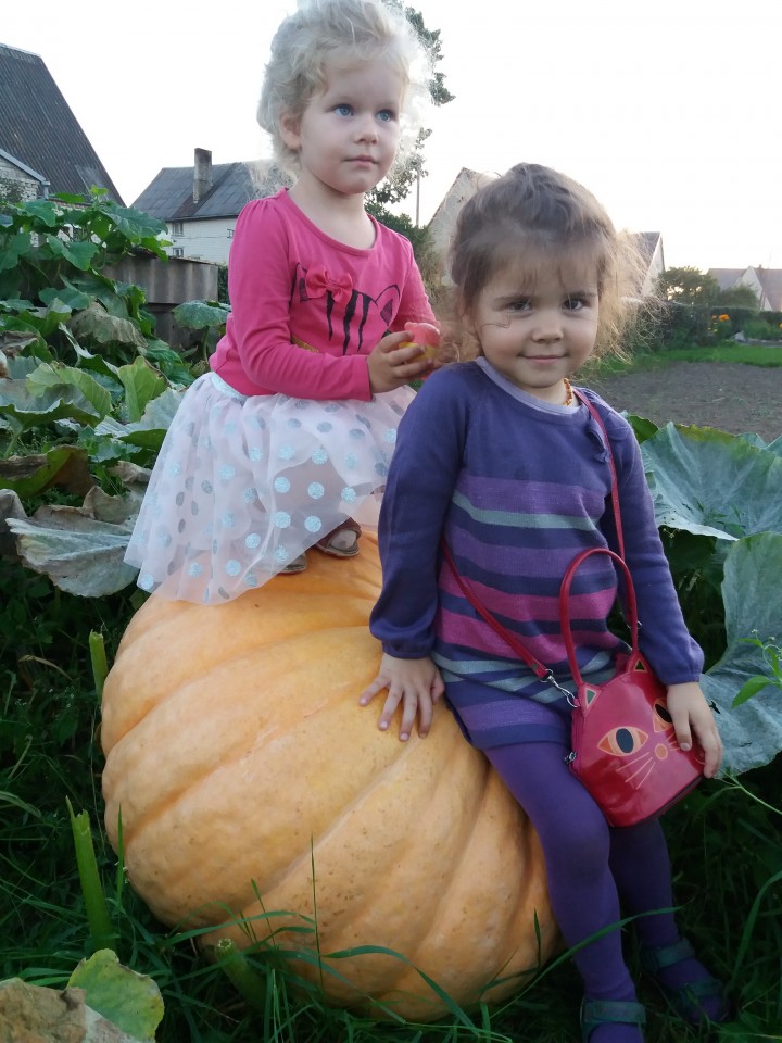 Anūkės Arija ir Austėja Jankūnaitės su moliūgu. Birutės Spundzevičienės nuotr.