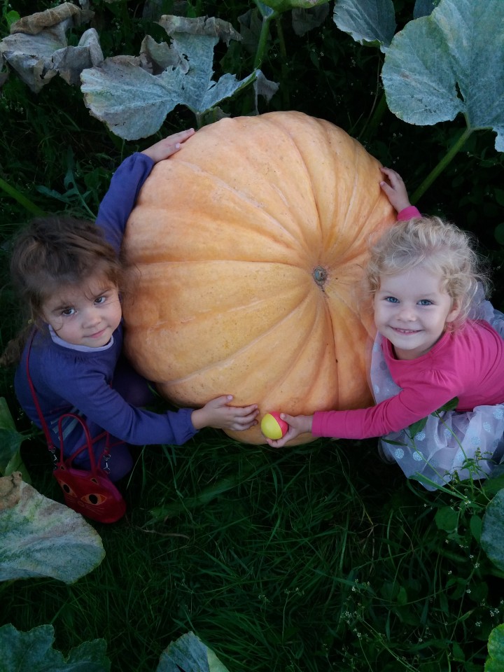 Su močiutės Onutės užsaugintu moliūgu (apimtis 2,58 m) anūkėlės Agnė ir Liepa. Onutės Alytės Černienės nuotr.