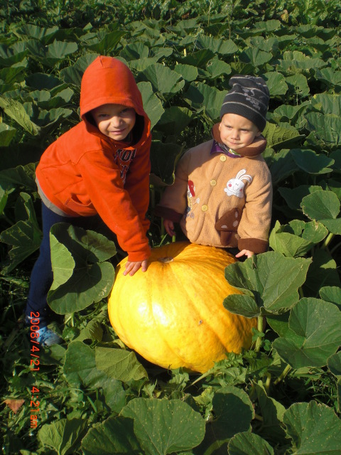Anūkai iš Suomijos Robertas ir Tomas džiaugiasi didžiuliu moliūgu. Vandos Leščiovos nuotr.
