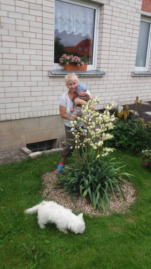 Gražuolę juką puoselėja Jolanta Janonienė su anūkėliu Dominyku ir kiemo sargu Arčiu.