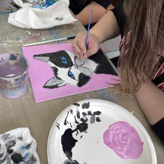 Dailininkai Asta ir Ligitas Keraičiai stovyklautojus mokė piešti ant drobės. Kūrybiniuose darbuose mokiniai žaismingai perteikė „kačiukų nuotaikas“.