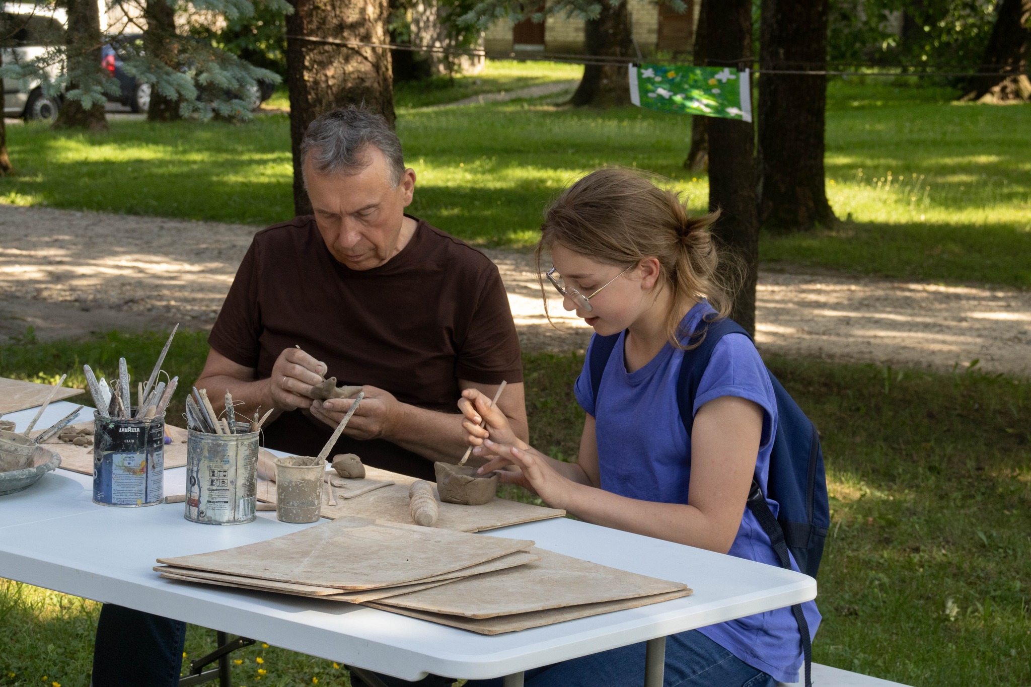 Dalintis: dalinimasis čia reiškia ne tik techninių įgūdžių perdavimą, bet ir patirties, įkvėpimo, jausmų bei istorijų pasidalijimą. Parodoje matome, kaip mokytojai perduoda savo žinias mokiniams, o pastarieji atranda naujus būdus išreikšti save, dalindamiesi savo kūrybiniais rezultatais su bendruomene. Dalijimasis apima ir refleksiją apie kūrybą, praeitį bei ateities galimybes.