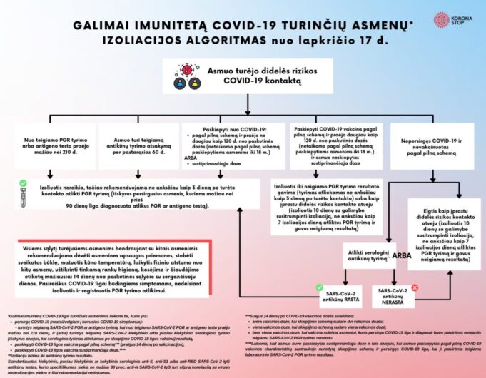 Izoliuotis privalės tik tie asmenys, kurie yra pasiskiepiję daugiau nei prieš 120 dienų ir jei asmuo neskiepytas sustiprinančiąja doze. Kontaktą su sergančiuoju turėjusiems asmenims PGR tyrimą reikės atlikti ne anksčiau kaip 3 dieną po turėto kontakto.