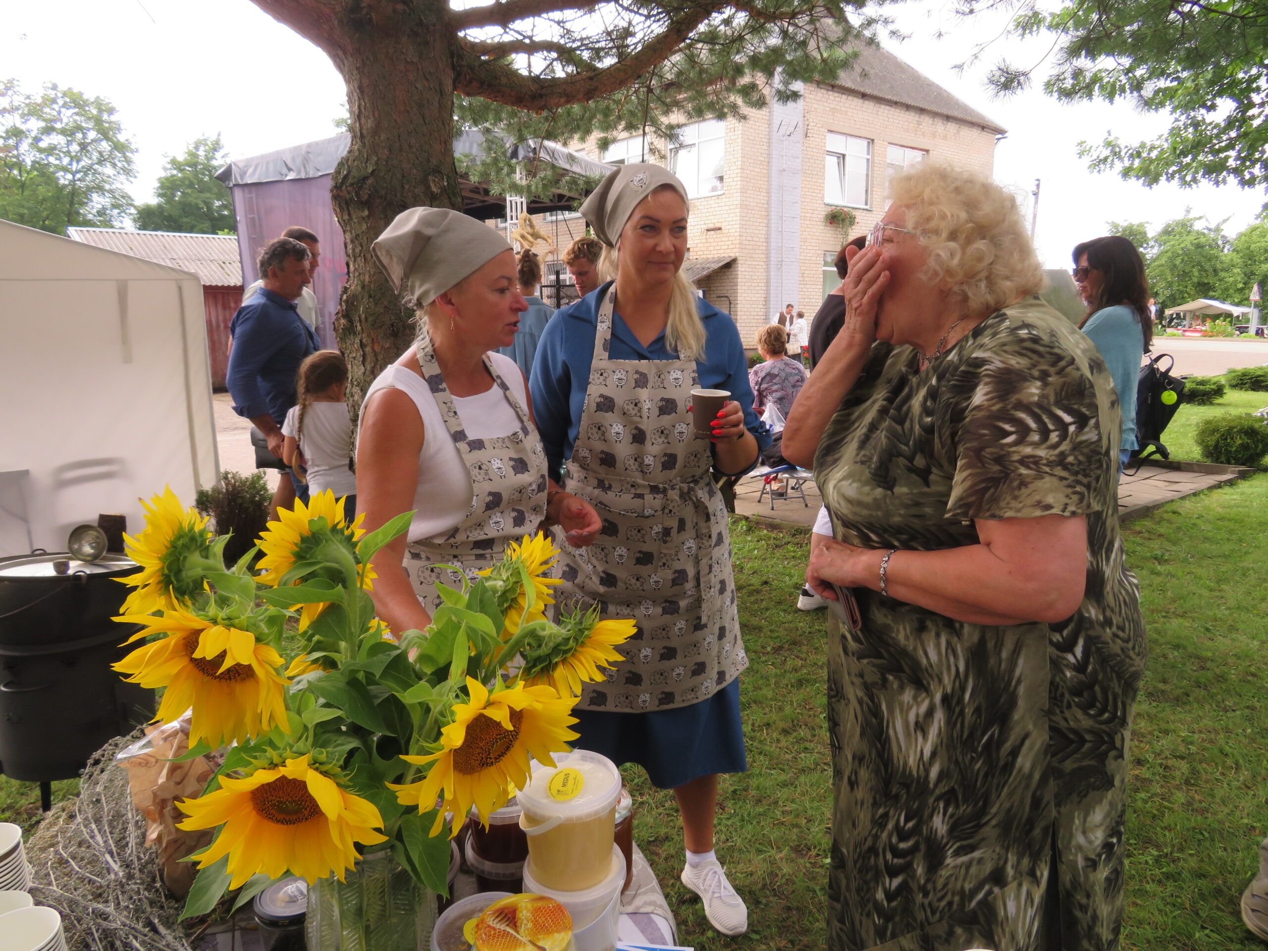 Iš bažnyčios žmonių minia pasipylė į miestelio centrą – kas nusipirkti namie keptos duonos ar pyrago, sūrių, dar dūmu kvepiančios žuvies ar puošmenų, rankdarbių, ilgų „kermošinių“ saldainių, o kas išbandyti tautodailininkų, amatų meistrų siūlomų užsiėmimų, edukacijų, išragauti ir apžiūrėti tai, ką siūlė bendruomenių kiemeliai.