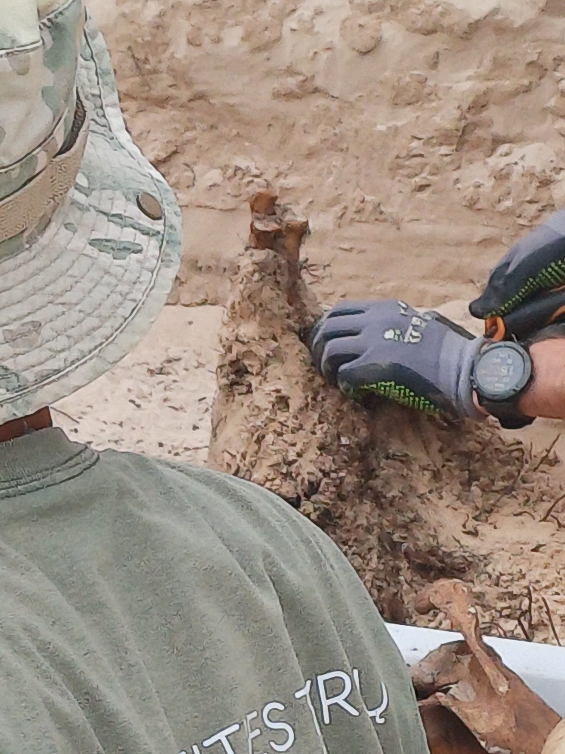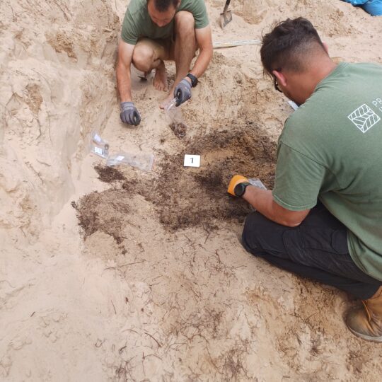 Per trumpą pusvalandį, kurį praleidome su dirbančiais archeologais, rasta keletas įdomių radinių. Jau akivaizdu, kad nužudyti partizanai į duobes buvo sumesti netvarkingai. Pirmieji palaikai gulėjo kniūbsti, kitoje duobėje du kūnai buvo sumesti skersai vienas kito. Prie pirmųjų palaikų, mums stebint, rasti rožinio likučiai, o prie kitų dviejų pradėta atkasinėti, kaip manoma, gertuvė.