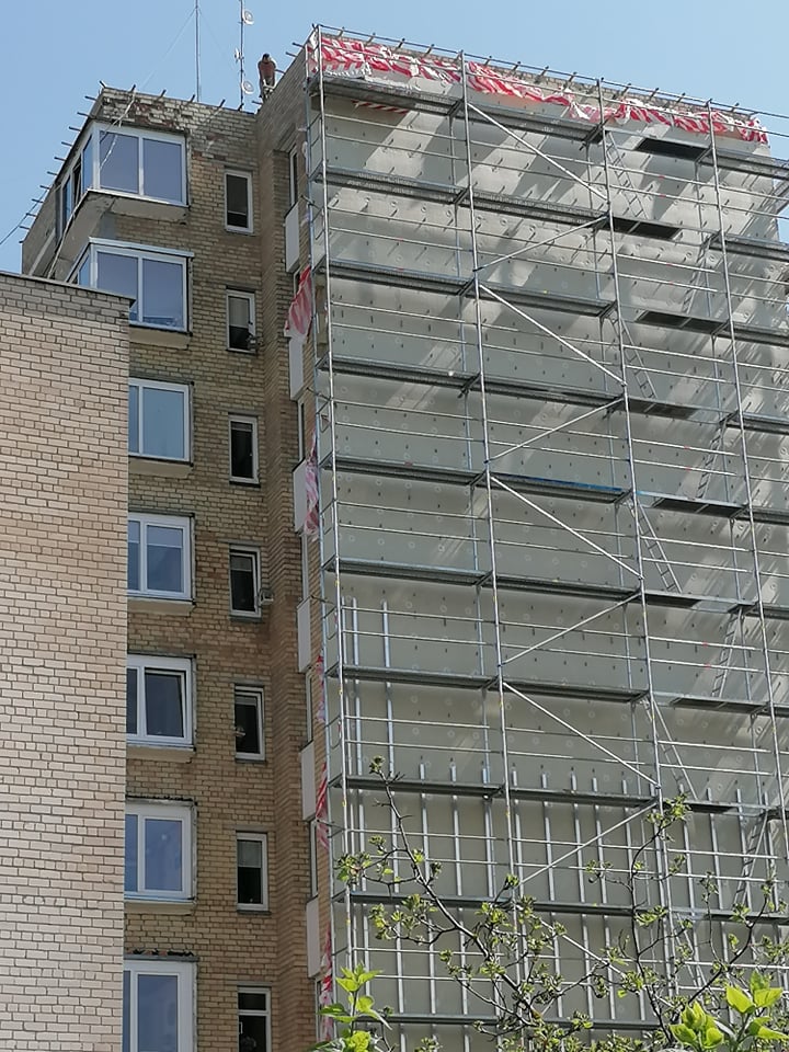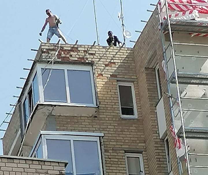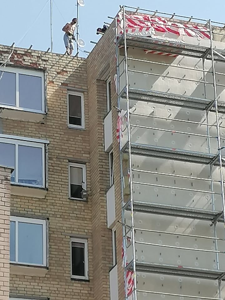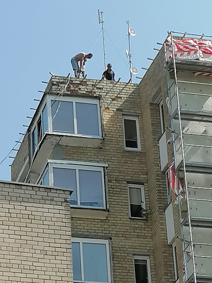 Nuotraukose matyti, kad ant renovuojamo devynaukščio stogo darbininkai dirba be jokių apsaugos priemonių.
