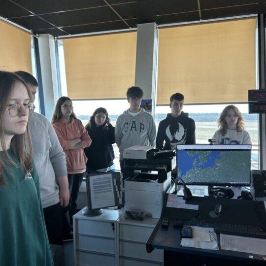 Antroji įstaiga – Kauno oro uostas. Matėme tai, ko įprasto keleivio akis nepamato. Ekskursiją pradėjome skrydžių valdymo bokšte. Išgirdome tikrus pilotų pokalbius su bokštelio darbuotoja. Čia pat išsiaiškinome ir visas oro uoste matomų linijų reikšmes, darbuotojų saugos subtilybes ir pan. Iš bokštelio judėjome į terminalą. Čia mums pateikė daug įdomios informacijos apie daiktų ir žmonių patikrą, pasiruošimą skrydžiui, viso personalo darbą. Buvo pristatytas oro uosto gaisro gesinimo transportas, jį ne tik apžiūrėjome, bet ir buvome pavežioti oro uosto teritorija. Ekskursiją vainikavo bendra nuotrauka. Sustojus jai darbuotojai įjungė ilgiausio nusileidimo ir kilimo tako Lietuvoje – net 3 km ir 250 m – žibintus.