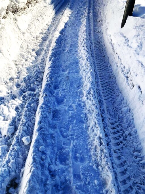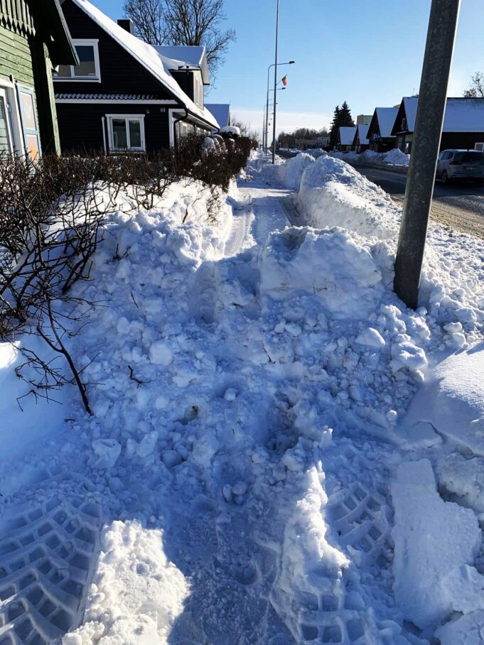 Ši žiema iš tiesų vargina. Stūkso kelių metrų aukščio sniego kalnai, o takai link namų kai kur tokie gilūs, kad sniego sienos siekia suaugusio žmogaus pečius. Vasario 13–14 dienomis taip stipriai snigo, jog dažno namo gyventojai nebekaltino komunalininkų ir patys ėmė valyti savo kiemus bei prieigas link jų. Laimingi tie, kurie galėjo keliauti traktoriaus vėžėmis. Vadinasi, traktorius pravažiavo ir tiek, kiek buvo galima, nuvalė šaligatvį. Ne visur traktoriui įmanoma apsisukti, ne visur technika gali pravažiuoti. Kai pagaliau liovėsi snigę, šaligatviai buvo valyti intensyviai: ir dabar dar yra vietų, kur sunku įžengti perėjon, bet jau darbuojamasi ir kastuvais. Nebenorėjome varginti komunalininkų klausimais, kai atsakymai ir taip aiškūs.