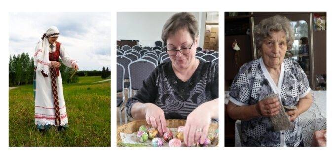 Kai kada prisikarpau česnako lukštų – vingeliais, gėlytėmis. Ant jų uždedu svogūno lukštą, aprišu marle ir metu į vandenį su dažais, verdu. Kad būtų įvairiau, prieš apdėdama česnako ir svogūno lukštais, prilipinu sudrėkintų žolelių. Tinka petražolių, morkų lapeliai. Morkų lapelių prisidžiovinu vasarą. Jie labai ploni, gerai prilimpa. Žolelės palieka baltus pėdsakus. Arba vietoje jų pasipilu kruopų ir jose apvolioju drėgną kiaušinį, apdedu svogūno lukštais, aprišu ir verdu vandenyje su dažais. Man gražiausi žali dažai, nes juose geriau „atsimuša“ svogūno lukštų spalva. Raudonuose dažuose geriau „atsimuša“ žolelių atvaizdas.