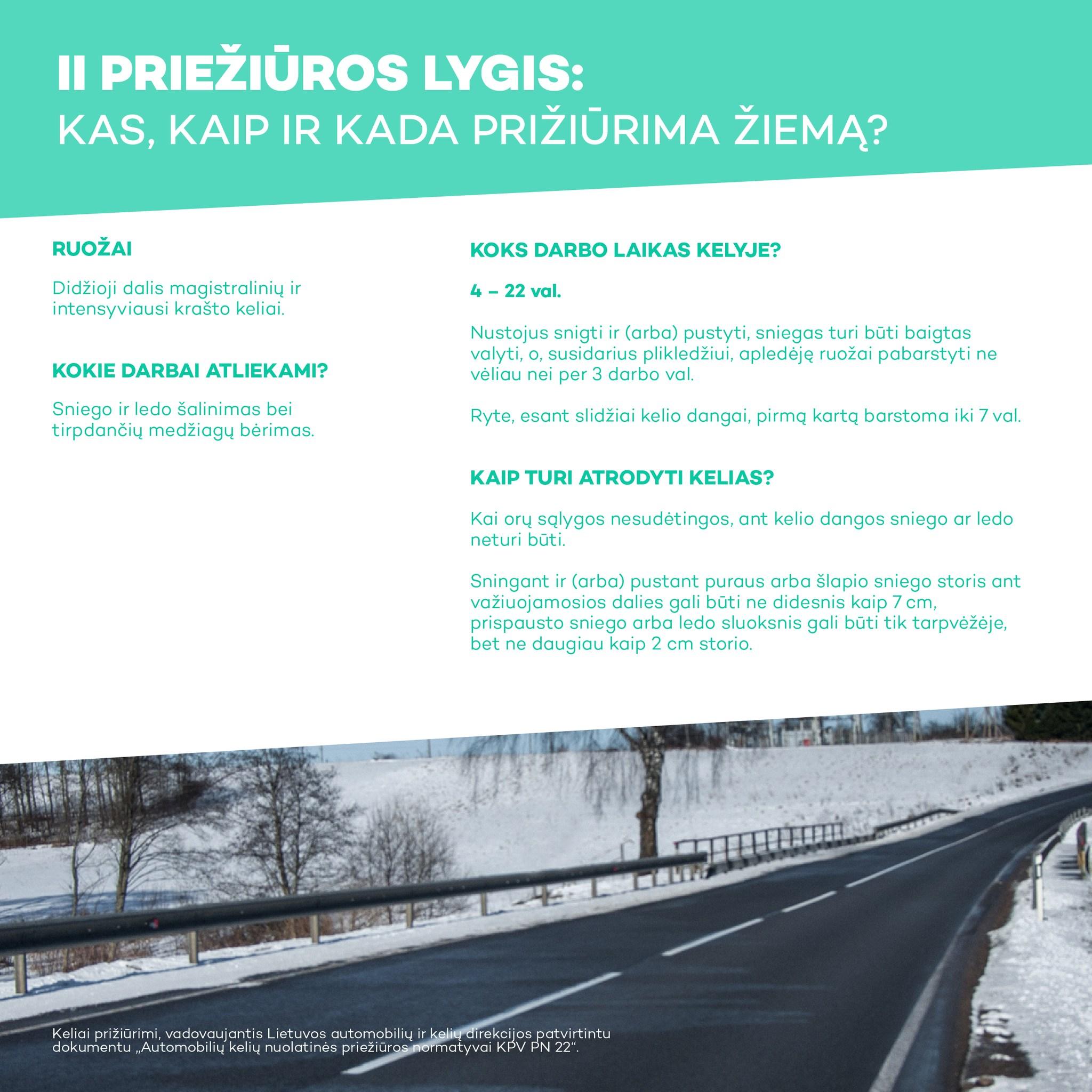 II priežiūros lygis. Šiuo lygiu prižiūrima didžioji dalis magistralinių kelių ir intensyviausi krašto keliai. Kelių priežiūros tarnybos šiuose keliuose budi, valo sniegą bei barsto slidumą mažinančias medžiagas nuo 4 iki 22 val. Šie keliai turi būti nuvalyti ir pabarstyti praėjus ne daugiau kaip 3 darbo val. nustojus snigti. Kai orų sąlygos įprastos, ant kelių dangos gali būti tik atsitiktinės sniego provėžos. Sningant ar pustant sniego storis ant važiuojamosios dalies gali būti ne didesnis kaip 7 cm. Ryte, esant slidžiai kelio dangai, pirmą kartą šiuos kelius būtina pabarstyti iki 7 val. Eismas, esant ypač sudėtingoms meteorologinėms sąlygoms, gali nutrūkti ne ilgiau kaip 4 val.