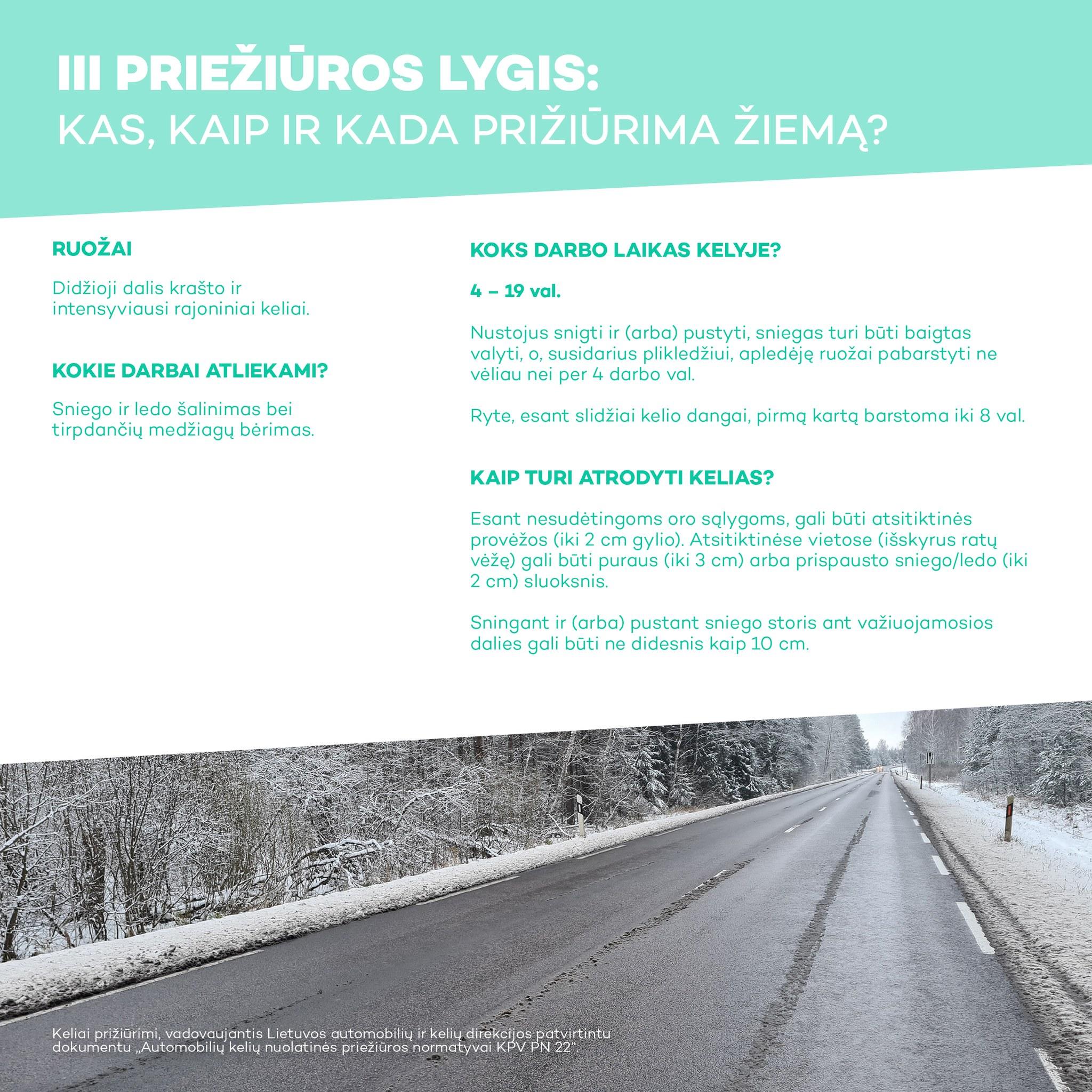 III priežiūros lygis. Šis lygis apima dalį krašto kelių ir intensyviausių rajoninių kelių prižiūrą. Kelių priežiūros tarnybos šiuose keliuose budi, valo sniegą bei barsto slidumą mažinančias medžiagas nuo 4 iki 19 val. Šie keliai turi būti nuvalyti ir pabarstyti praėjus ne daugiau kaip 4 darbo val. nustojus snigti. Kai orų sąlygos įprastos, ant kelių dangos gali būti ne gilesnių kaip 2 cm sniego provėžų. Sningant ar pustant sniego storis ant važiuojamosios dalies gali būti ne didesnis kaip 10 cm. Ryte, esant slidžiai kelio dangai, pirmą kartą šiuos kelius būtina pabarstyti iki 8 val. Eismas, esant ypač sudėtingoms meteorologinėms sąlygoms, gali nutrūkti ne ilgiau kaip 8 val.