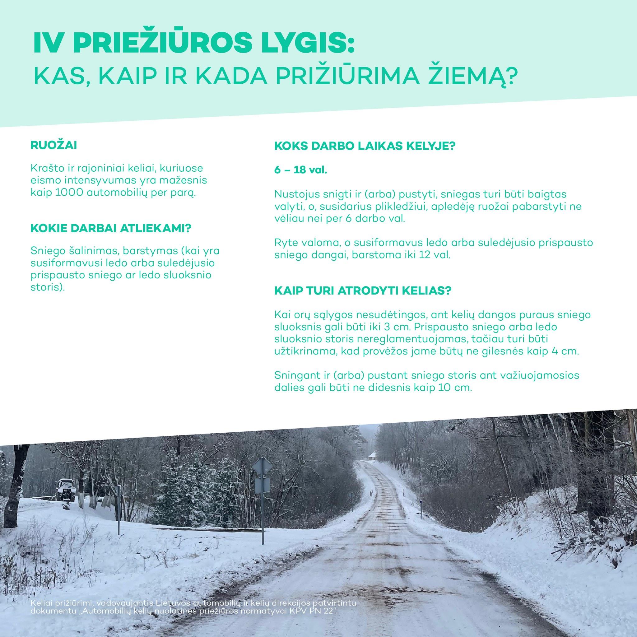 IV priežiūros lygis. Pagal šio lygio aprašymą prižiūrimi krašto ir rajoniniai keliai, kuriuose eismo intensyvumas yra mažesnis kaip 1000 automobilių per parą. Kelių priežiūros tarnybos šiuose keliuose budi, valo sniegą bei barsto slidumą mažinančias medžiagas nuo 6 iki 18 val. Šie keliai turi būti nuvalyti ir pabarstyti praėjus ne daugiau kaip 6 darbo val. nustojus snigti. Kai orų sąlygos normalios, ant kelių dangos sniego gali būti iki 3 cm. Sningant ar pustant sniego storis ant važiuojamosios dalies gali būti ne didesnis kaip 10 cm. Ryte, esant slidžiai kelio dangai, pirmą kartą šiuos kelius būtina pabarstyti iki 12 val. Eismas, esant ypač sudėtingoms meteorologinėms sąlygoms, gali nutrūkti ne ilgiau kaip 10 val.