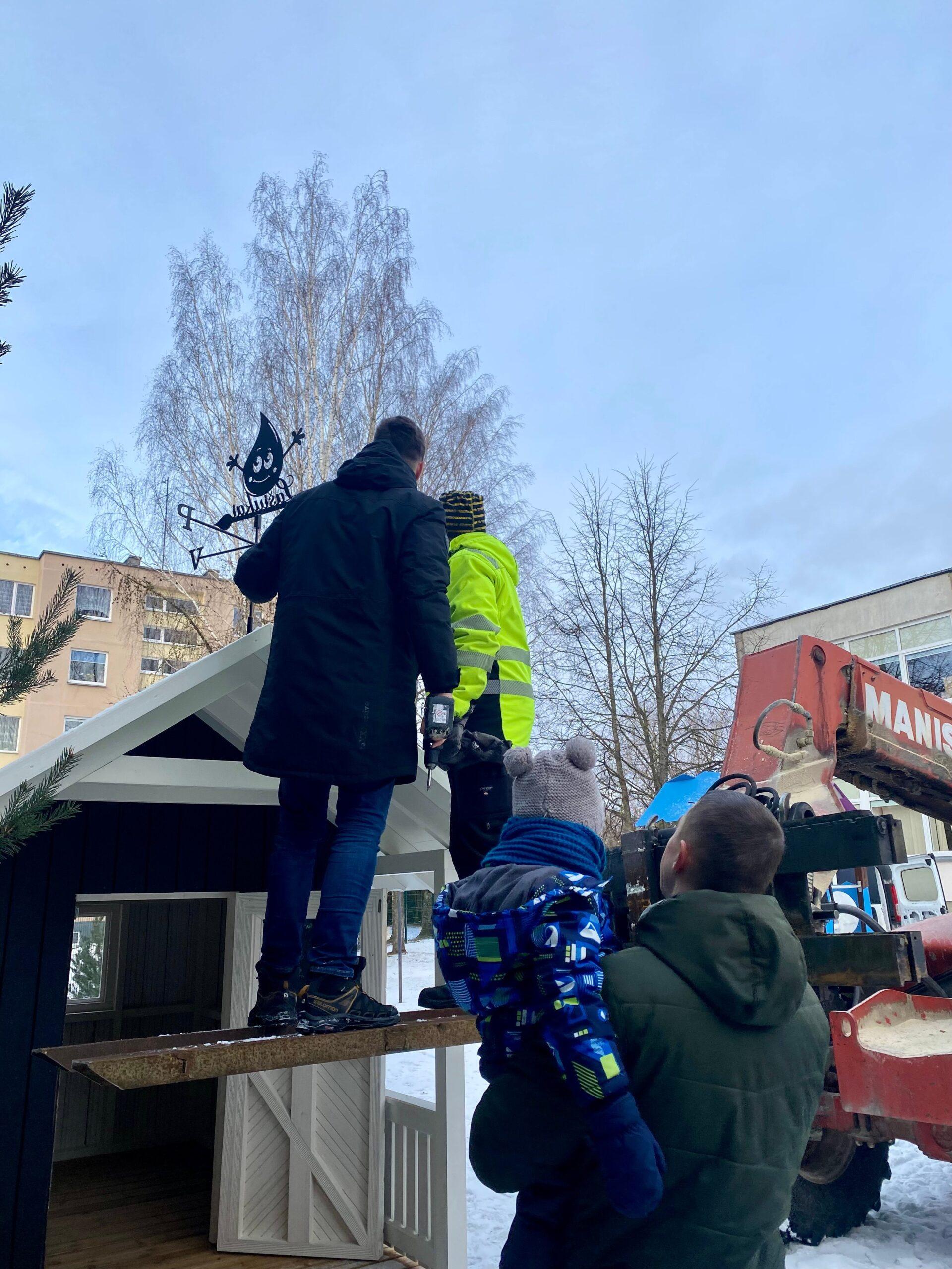 Ir tikrai – po kelių dienų namelis buvo atvežtas ir keltuvais gražiai pastatytas. Maža to, kitas tėvelis, turintis savo metalo pjaustymo įmonę „Plazmita“, pasisiūlė nameliui padaryti metalinę vėtrungę su „Lašelių“ grupės ženklu. Žodžiu, naująjį statinį kūrė visi. Džiaugėsi taip pat.