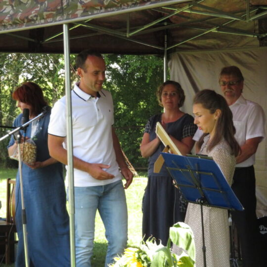 Smagų, nuotaikingą koncertą dovanojo Kriaunų kapela „Kriauna“. Jos vadovas Alvydas Fijalkauskas tarp polkų, valsų ir dainų pasakojo istorijas apie mergeles, bernelius ir jų vestuves. Trankios melodijos nepaliko abejingų. Vietiniai nelabai veržėsi šokti, tačiau į „Kazlėkinę“ atvažiavusieji rokiškėnai poromis elegantiškai sukosi kone per kiekvieną kūrinį. Taip pat koncertavo Kazliškio kultūros namų saviveiklininkai ir mažoji Beatričė.