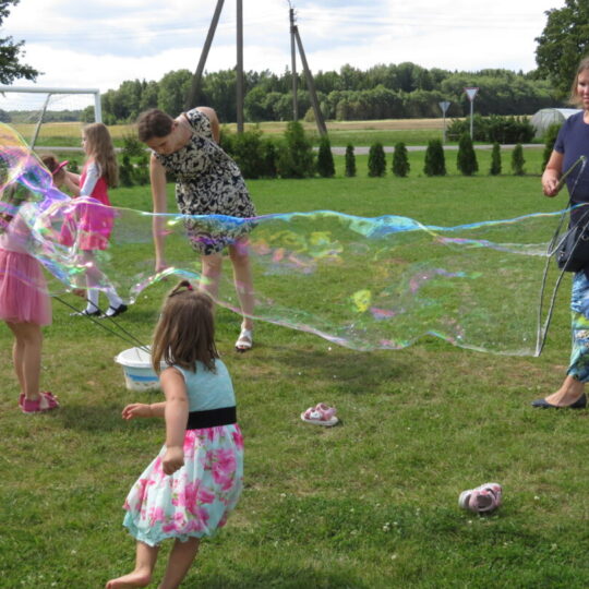 Tuo metu vaikai smagiai pūtė didžiulius muilo burbulus. Iš pradžių jiems nelabai pavyko, todėl į pagalbą atėjo mamos. Renginiui artėjant į pabaigą, dideli burbulai sukosi ne tik pievoje, bet ir kilo aukštyn. Sekmadienio linksmybės baigėsi skaniausios, Kazliškio šeimininkių virtos košės – „kazlėkienės“ – valgymu.