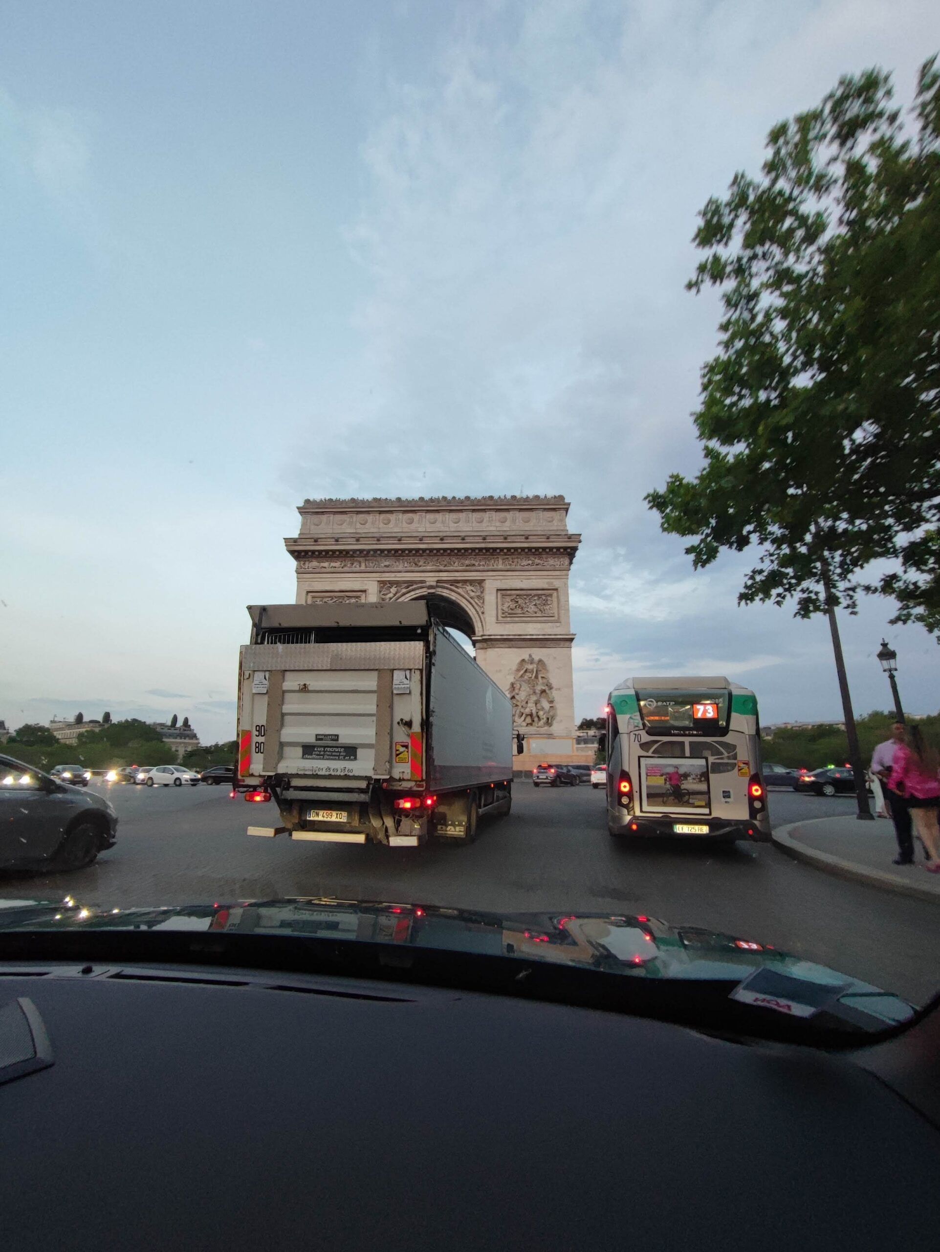 Iš oro uosto automobiliu pajudėjome apie 20.45 val. ir kadangi nė vienas nesame buvę Paryžiuje, nusprendėme aplankyti Eifelio bokštą. Vakaras buvo gražus, grožėjomės Prancūzijos gamta, beje, taip pat smarkiai nukentėjusia nuo sausros. Vos pasiekėme Paryžių, vaizdas pasikeitė. Lietuviai vadinami tvarkinga tauta – šį pusmetį apsilankęs Italijoje, o dabar ir Paryžiuje tuo įsitikinau. Sostinę pasiekėme greitkeliu, vaizdas buvo nekoks: sienos ir kita užpaišyta grafičiais, šiukšlės, pavargę pastatai ir pan. Ne ką geresnis vaizdas ir pačiame mieste, artėjant prie Triumfo arkos. Eismas aplink arką suplanuotas žiedu, bet ten važiuoja „kiekvienas už save“. Įsuki į žiedą, kur nėra juostų, ir taisyklės dingsta: kažkas važiuoja skersai, kažkas stovi, kažkas lenda į priekį, kažkur fone policija su švyturėliais, kažkas sugalvoja išsukti ir pan. Būtų įdomu pamatyti, kaip vairuoti mokosi vietiniai… Kita vertus, pavažiavęs šiuo „žiedu“ būtum puikiai pasiruošęs ir Azijos šalių chaosui kelyje.