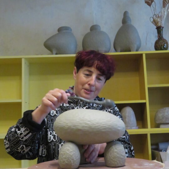 Viena iš jų, latvė Anda Svarane, atvažiavusi iš Zase miestelio, Lietuvoje jau nebe naujokė. Pasak jos, ilga, net 20 metų draugystė sieja ją ir Igorį Kovalevskį, Arūną Augutį, Egidijų Radvenską. „Į plenerus kviečiamės vieni kitus, nes žinom, kad bus darbų kokybė. Pasikvietus nepažįstamą menininką, pasitaiko netikėtumų tiek į gerąją, tiek į blogąją pusę. Man svarbiausia išraiškinga faktūra, o įkvėpimo semiuosi iš gamtos“, – dailindama abstrakčios formos lipdinį kalbėjo Anda. Ji pristato interjerui skirtas monumentalias vazas – indus, kurie subtiliai dekoruoti pasikartojančiomis faktūromis.