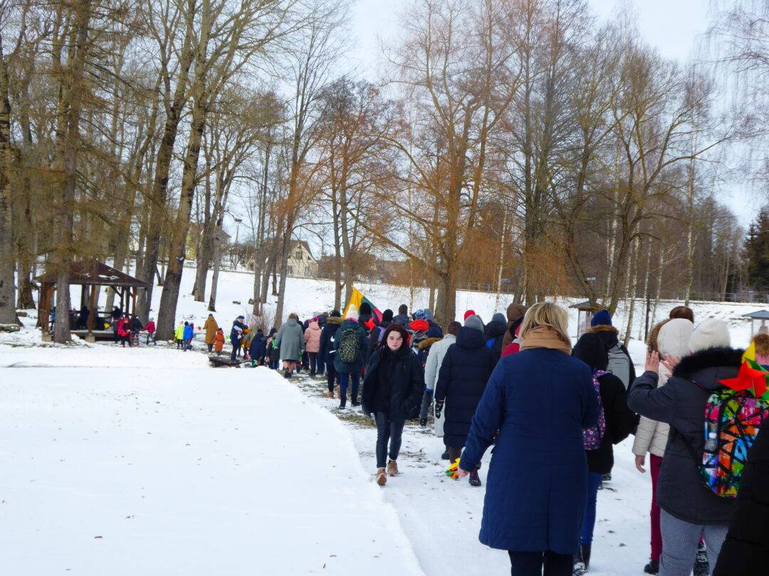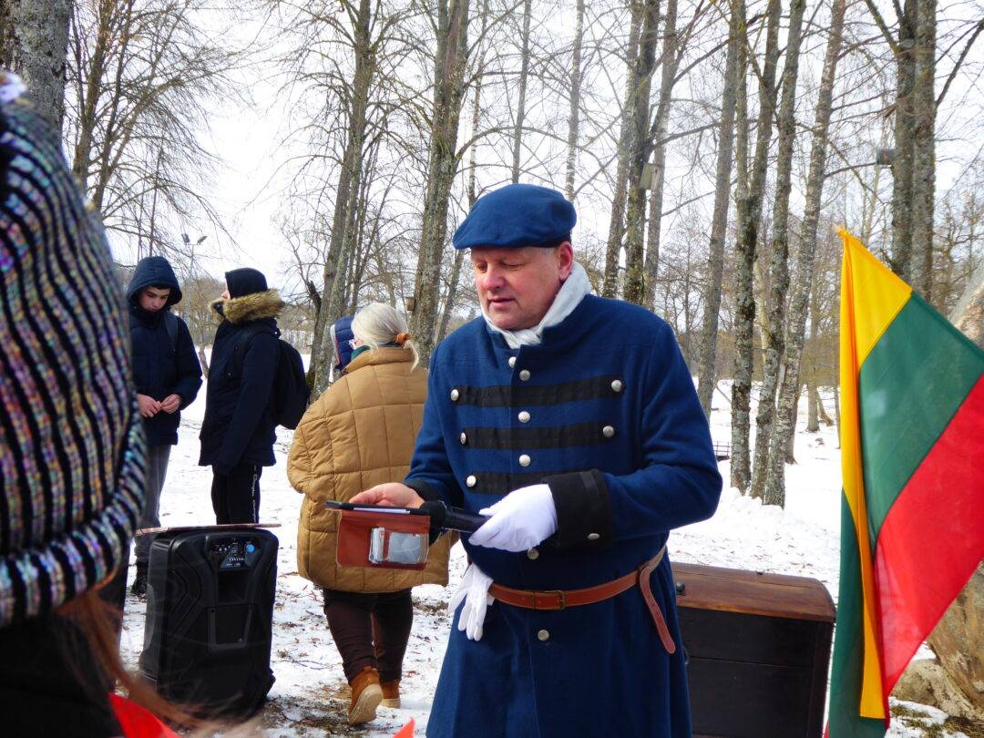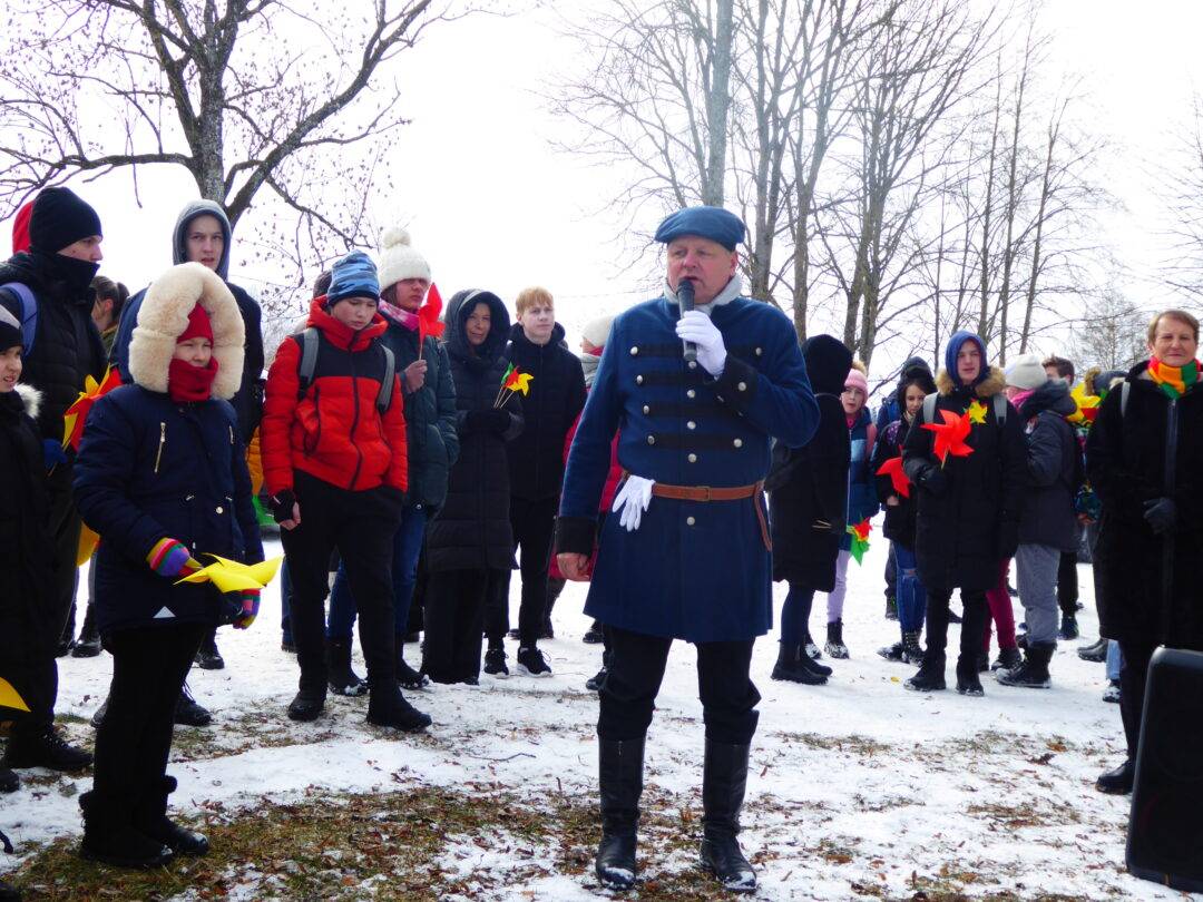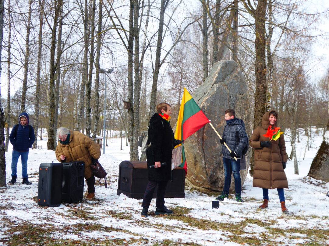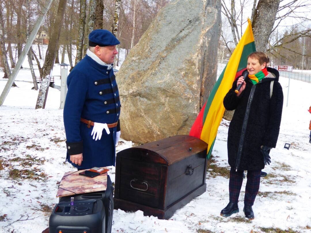 Prie paminklinio akmens laukė Laisvės kovų istorijos muziejaus darbuotojai, Obelių seniūnės pavaduotoja l. e. seniūnės pareigas Aldona Žėkienė, Obelių socialinių paslaugų namų kultūros padalinio atstovai, iš kurių aktyviausia – Violeta Kazlauskienė. Vaikai prieš kelionę buvo pasigaminę trispalvius malūnėlius. Jie tapo renginio akcentu. Muziejininkai buvo parengę staigmeną – inscenizaciją, kurioje „bajoras“ – istorikas Valius Kazlauskas – ne tik visus sveikino su Nepriklausomybės atkūrimo diena, bet ir tapo kelionės vedliu, pasakojančiu Obelių miestelio istoriją. Telefonu susisiekta su kunigaikščių Giedraičių palikuoniu, aktoriumi Rimantu Giedraičiu. Jis perdavė šilčiausius linkėjimus Kovo 11-osios proga.