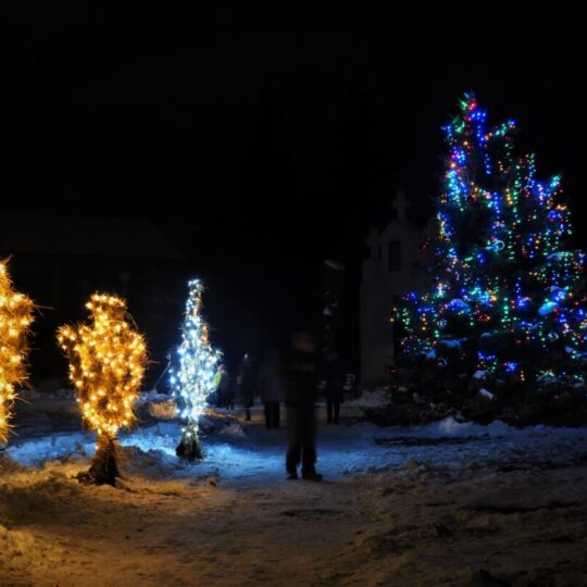 Šiais metais šventėms eglę iš savo sodybos padovanojo kriauniečiai Irena ir Gintautas Bajorai. Beje, ji, kaip ir Kamajuose nušvitusi eglė, taip pat dvikamienė.