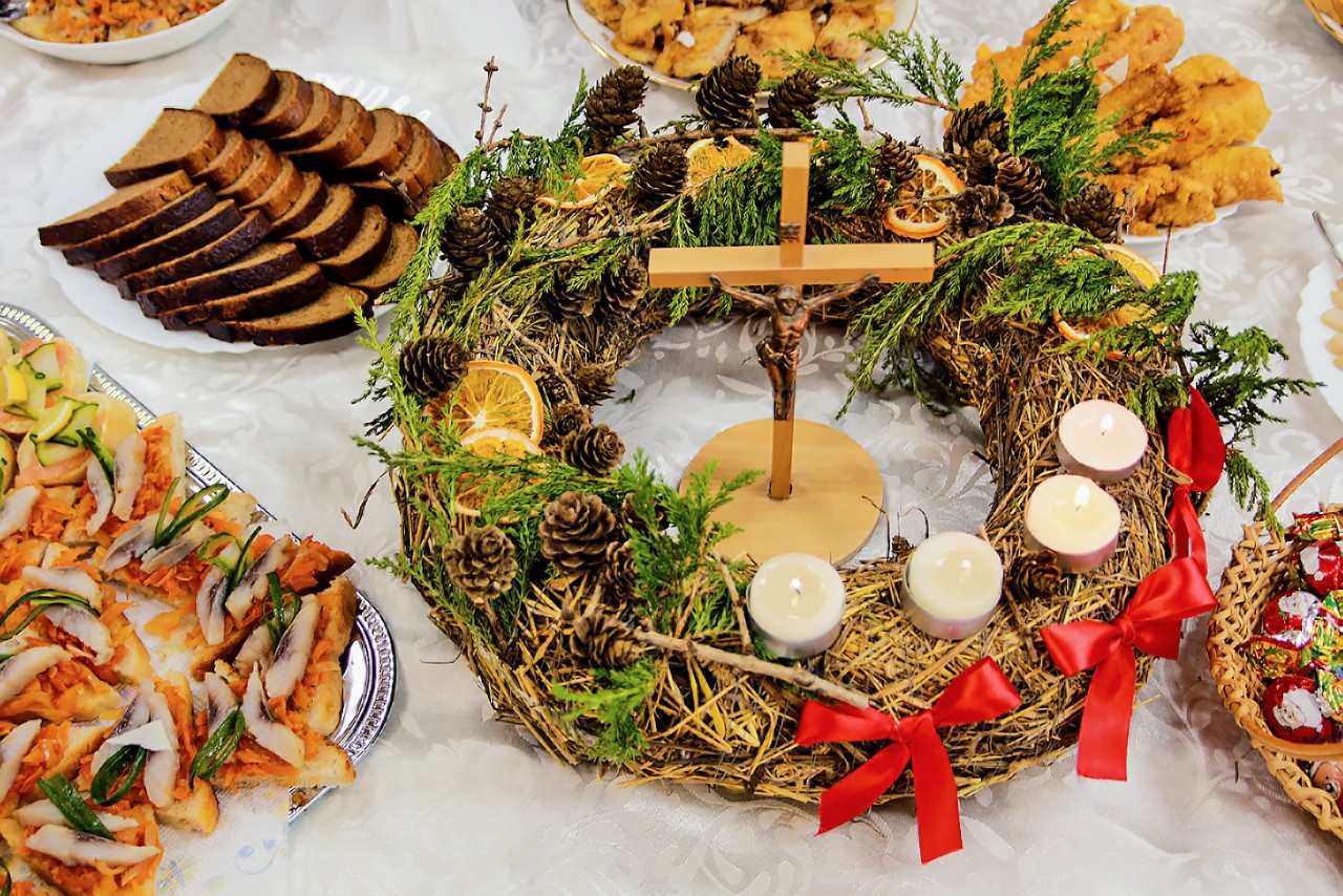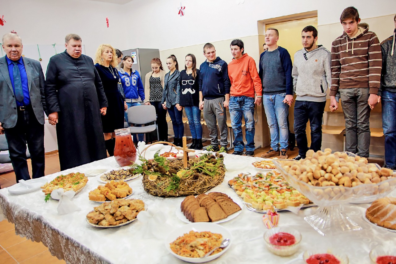 Maisto ruošimo technologijų kabinete pagal katalikų papročius paruošėme šventinį stalą, kurį dekanas palaimino. Išgirdome ištrauką iš šv.Evangelijos, sužinojome apie šv. Kūčių ir Kalėdų papročius ir tradicijas. Dekanas akcentavo bendrystės ir atlaidumo svarbą mūsų pasaulyje. Ragavome dvylika patiekalų, traukėme iš po baltos staltiesės šieną ir būrėme ateitį. Vieniems tai buvo matyta ir įprasta, kitiems- nauja patirtis.