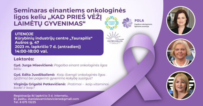 Lapkričio 7 d. Utenos kūrybinių industrijų centre „Taurapilis“ vyks seminaras einantiems onkologinės ligos keliu „Kad prieš vėžį laimėtų gyvenimas“, kuriame lektorės pasakos, kaip išvengti ligos grįžimo, atskleis, kaip pagerinti gyvenimo kokybę susirgus, bei aptars pratimus.