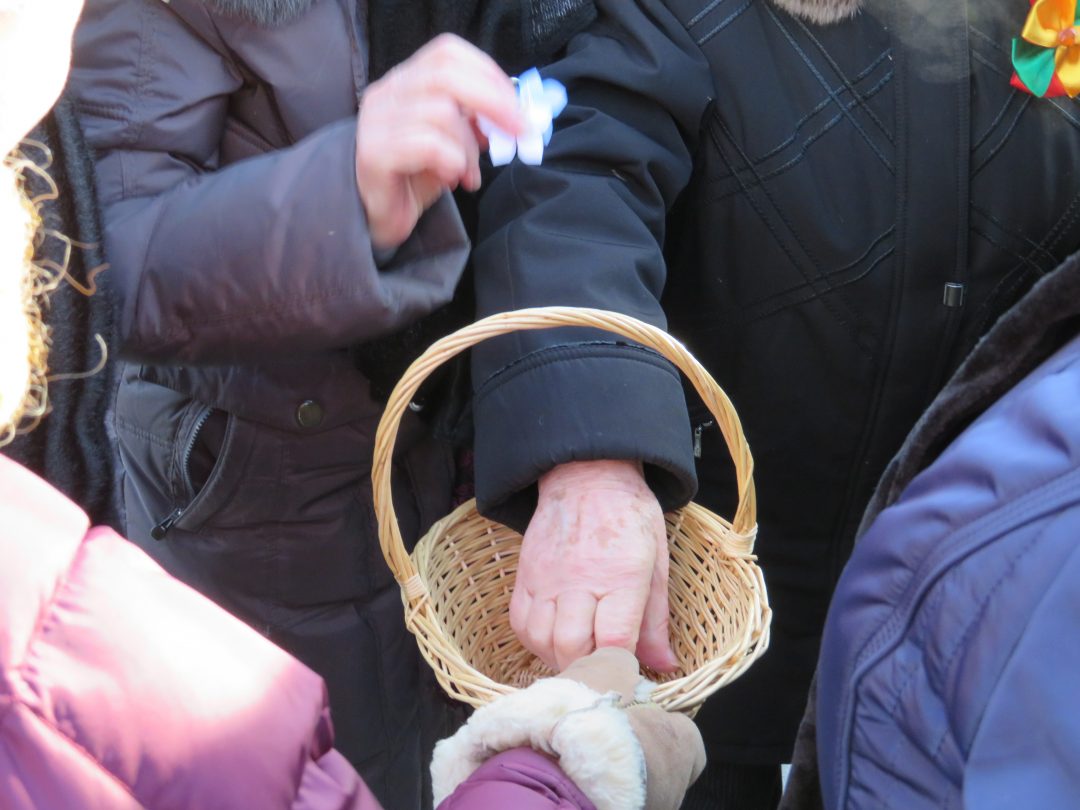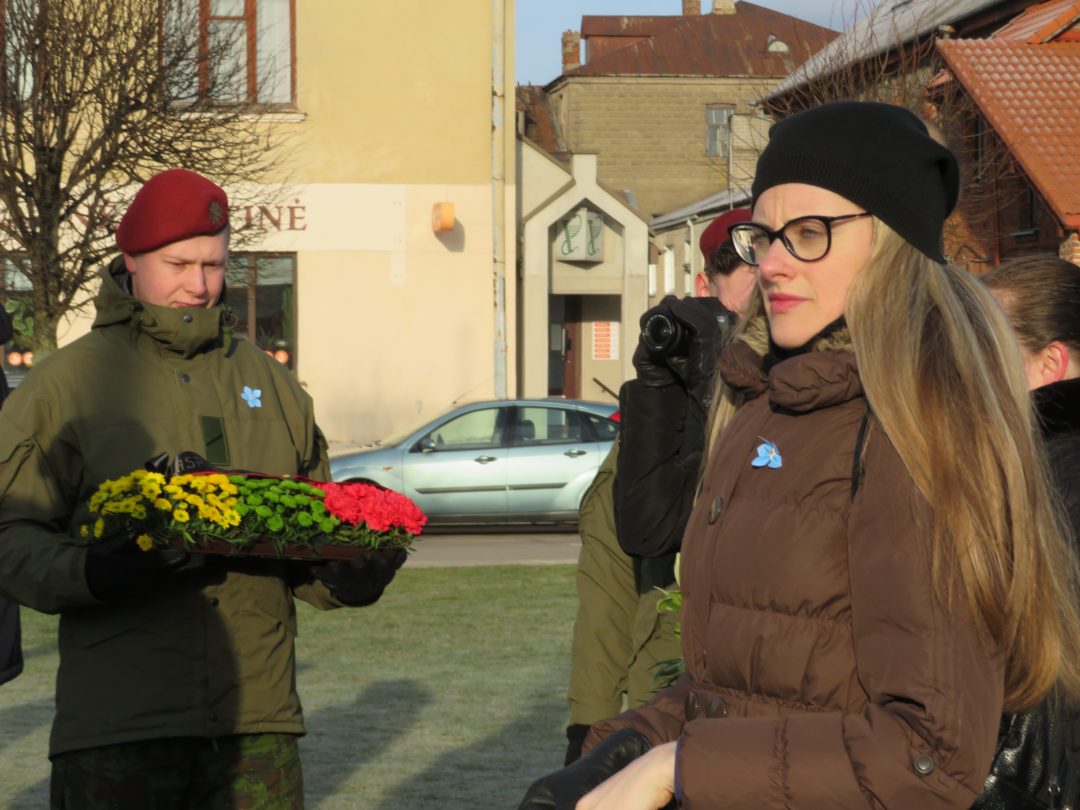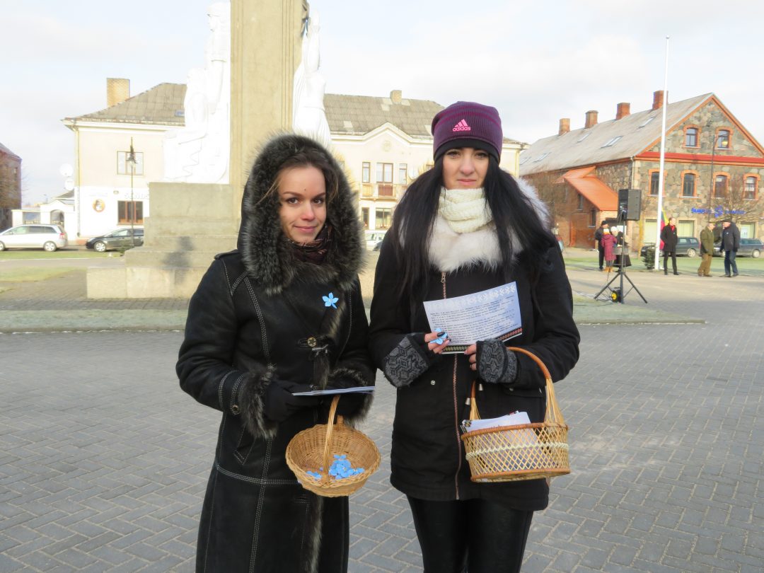 Savanoriaujančios merginos simboliniais neužmirštuolių žiedais apdovanojo visus minėjimo dalyvius.