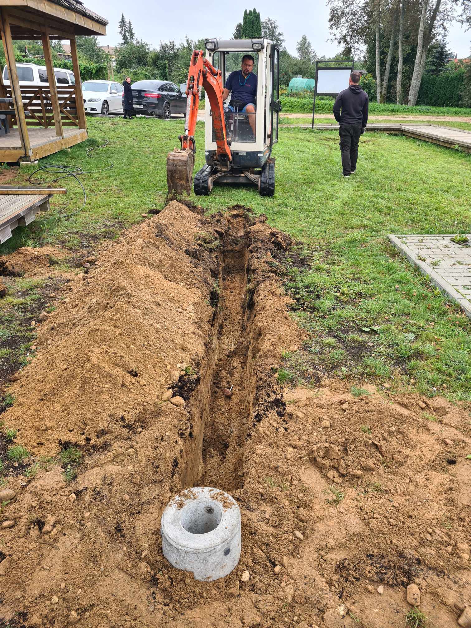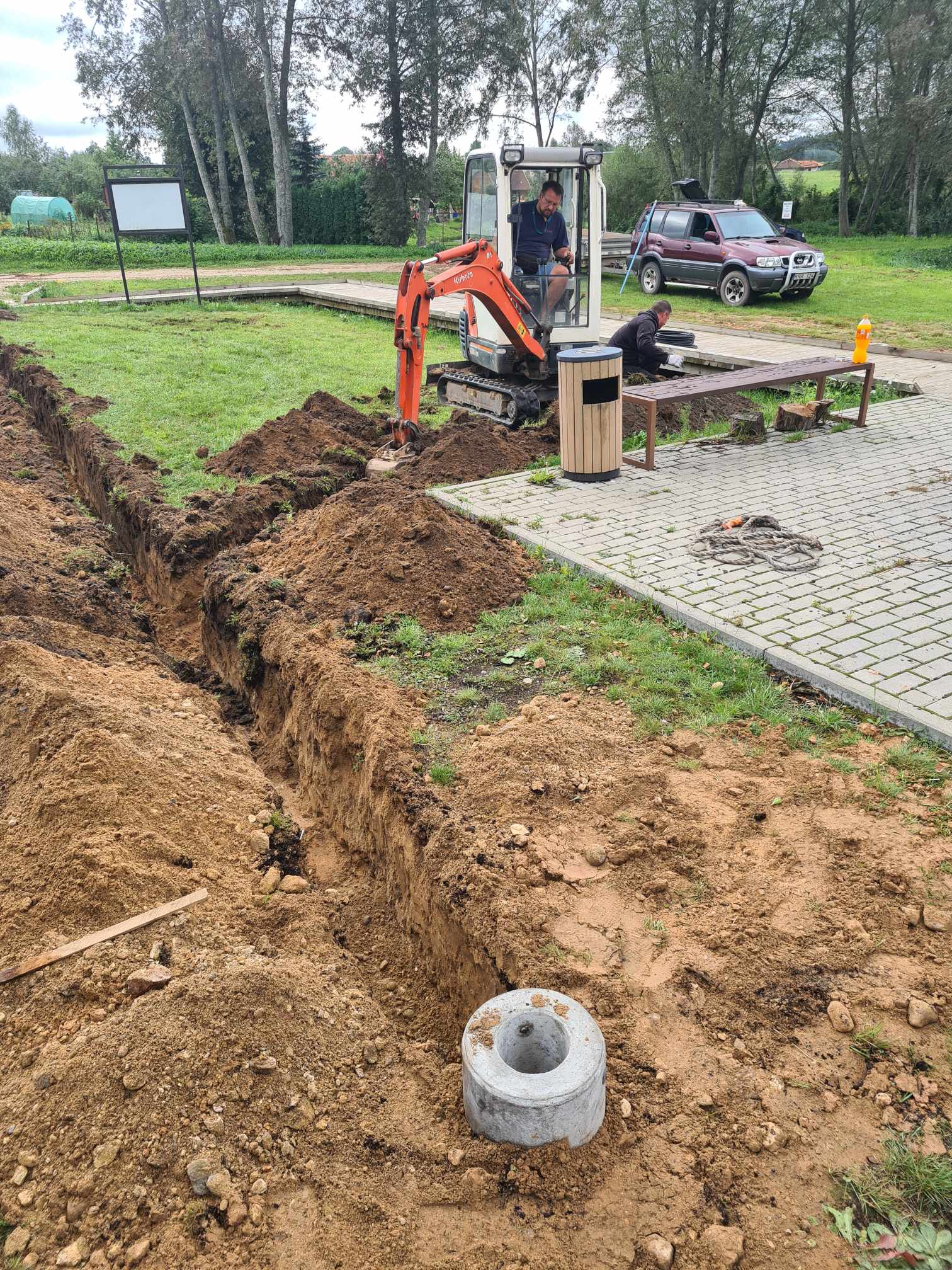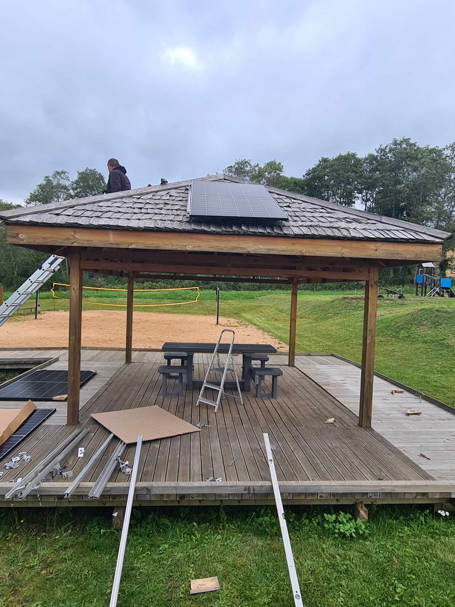 Projekto metu bus įrengtas apšvietimas, o tam mums reikėjo saulės elektrinės. Ji jau yra sumontuota, bet dar nepaleista. Viskas labai užtruko, saulės elektrinę mums vežė netgi porą mėnesių. Ne ką paprasčiau buvo ir dėl parko šviestuvų: Lietuvoje suradome šviestuvo „galvą“, bet nebuvo atramų. Pasirodo, gauti tokius dalykus labai sunku arba jie labai brangūs ir mums neįperkami. Visas reikiamas detales gavome vos prieš porą savaičių. Šiuo metu jau pakloti kabeliai šviestuvams, sumontuotos atramos, pastatyti saulės kolektoriai. Labai dėkojame Dariui Kavaliauskui, kuris padėjo organizuoti kasimo darbus, montavimo darbais gelbėjo Marius Datkūnas, Romas Pupelis, spontaniškai sukvietėme talką, kad sulygintume žemes, prie to prisidėjo bendruomenės nariai.