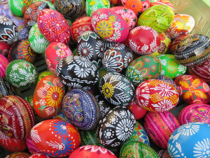 Turguose spalvų gausa ir marginimo raštais akį pavilioja išskirtiniai medinukai. Matyt, dėl šios priežasties praėjusio ketvirtadienio Rokiškio turguje pirkėjai ir smalsaujantieji nuolat būriavosi prie stalo, nukrauto dažytais mediniais margučiais, jų ruošiniais, kiaušiniams dažyti skirtų dažų pakuotėmis, spalvotų lakų buteliukais, tikrais dažytais kiaušiniais. Jais prekiaujantys Vytautas ir Elena atvyko iš Vidurio Lietuvos. Pasak jų, medinius kiaušinių ruošinius gauna iš Ukrainos. Patiems juos gaminti būtų per daug sudėtinga, nes atimtų nemažai laiko. Anksčiau iš ten pat atsiveždavo dažytų margučių, bet dabar marginti išmoko patys, todėl didžiulėje lėkštėje matosi tik vienas kitas ukrainietiškų raštų margutis. Jų yra ir įprasto vištos kiaušinio dydžio, ir gerokai mažesnių. Atskiroje lėkštėje sudėti lipdukais apklijuoti medinukai. „Tai vaikams“, – sako pardavėjai.